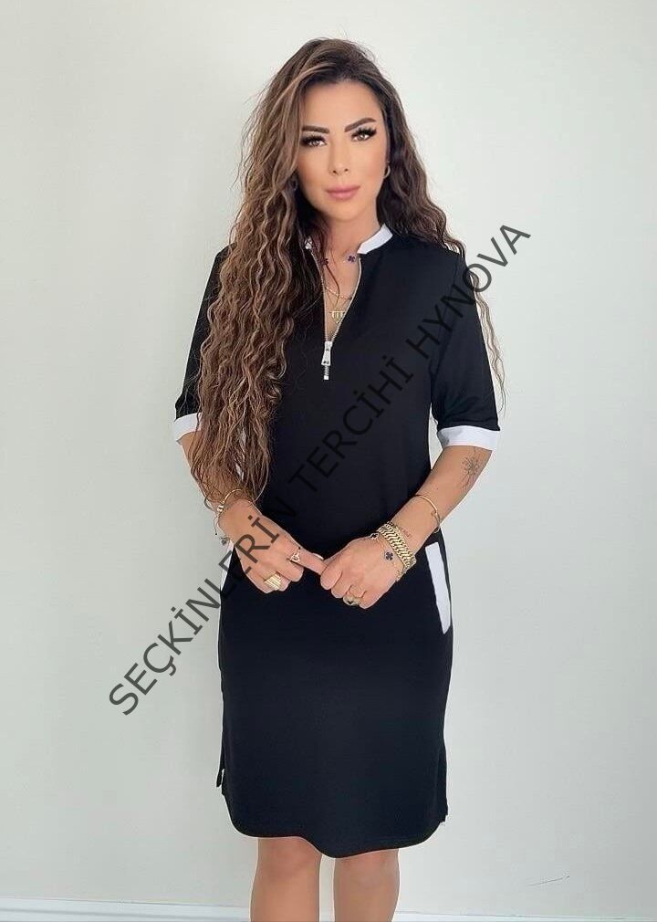 Kadın Kısa Kollu Yakadan Fermuarlı Cepli Yandan Yırtmaçlı Viskon Elbise
