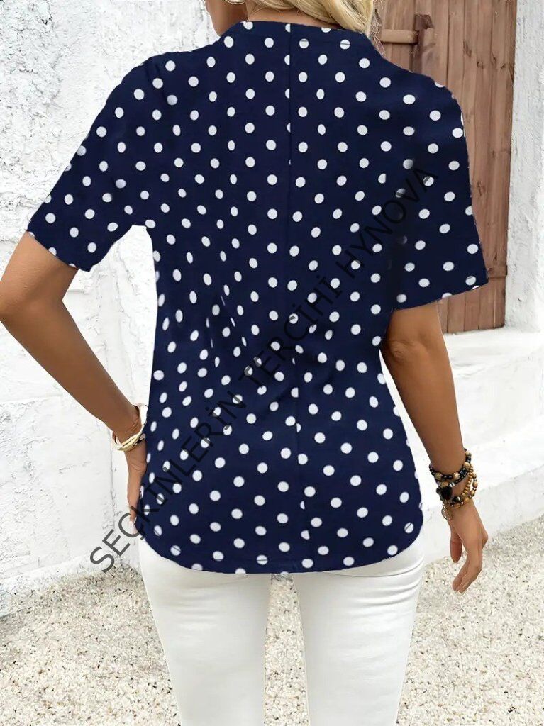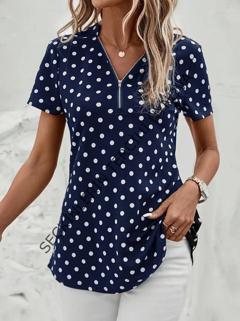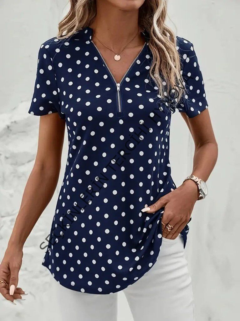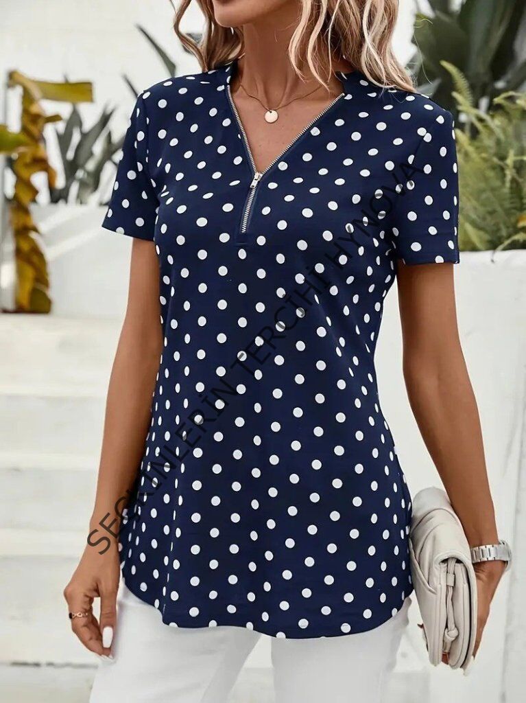 Kadın Kısa Kollu Yakadan Fermuarlı Puantiyeli Uzun Dokuma Viskon Bluz