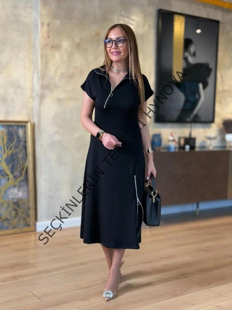 Kadın Kısa Kollu Yakadan Ve Etekten Fermuarlı Midi Viskon Iki Iplik Elbise