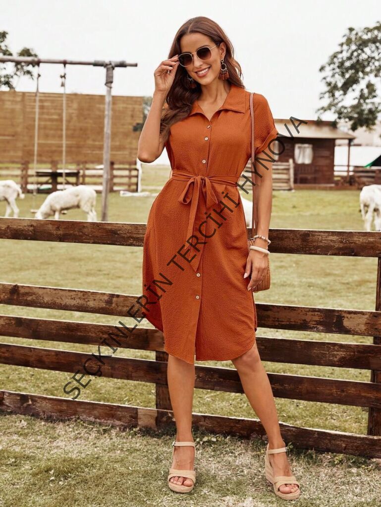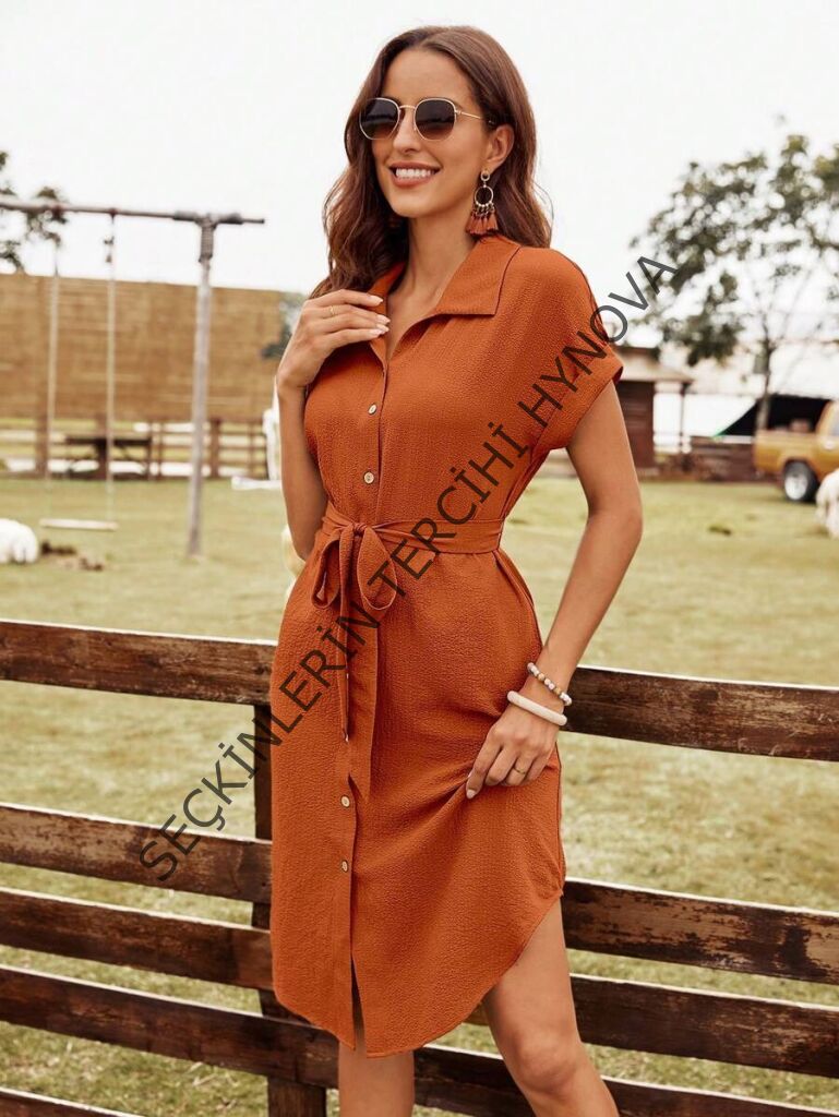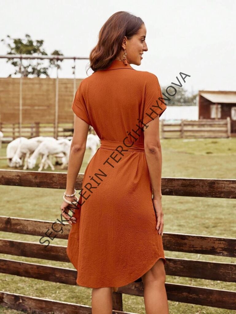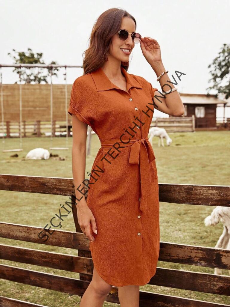 Kadın Kısa Kollu Yakalı önden Düğmeli Beli Kuşaklı Bürümcük Elbise
