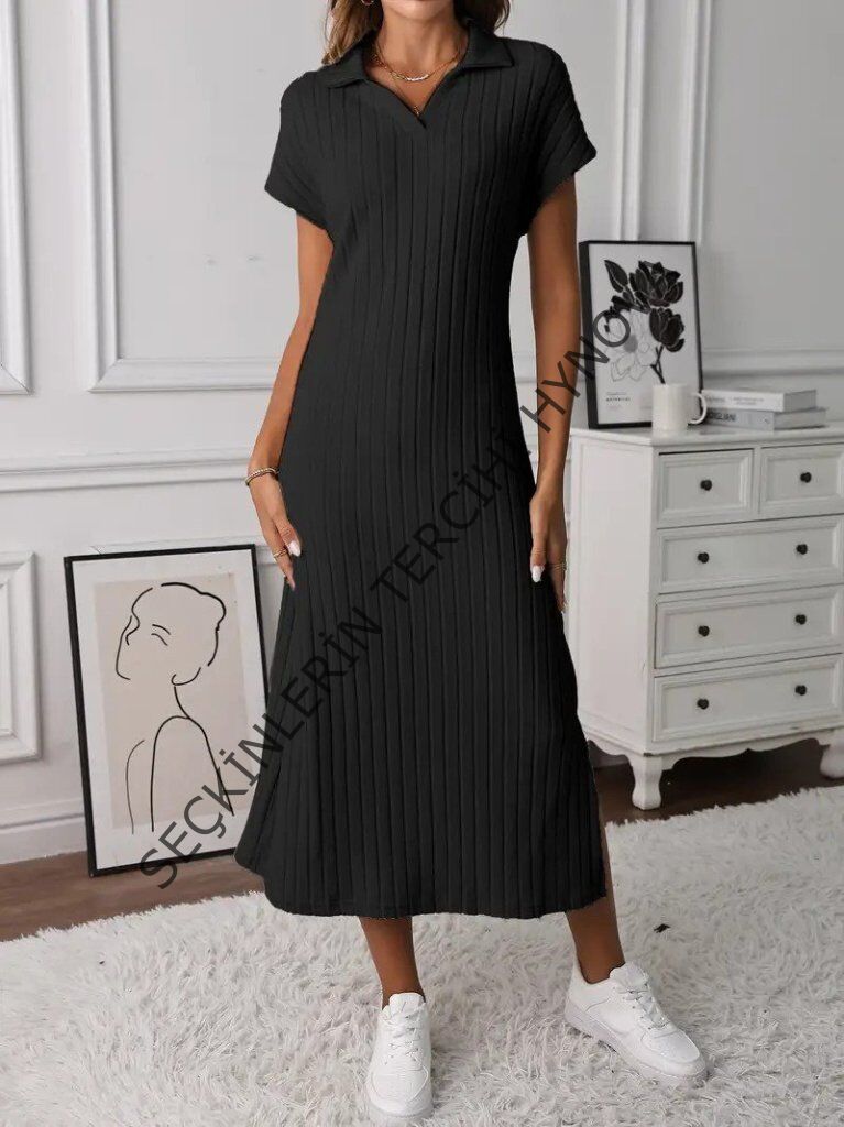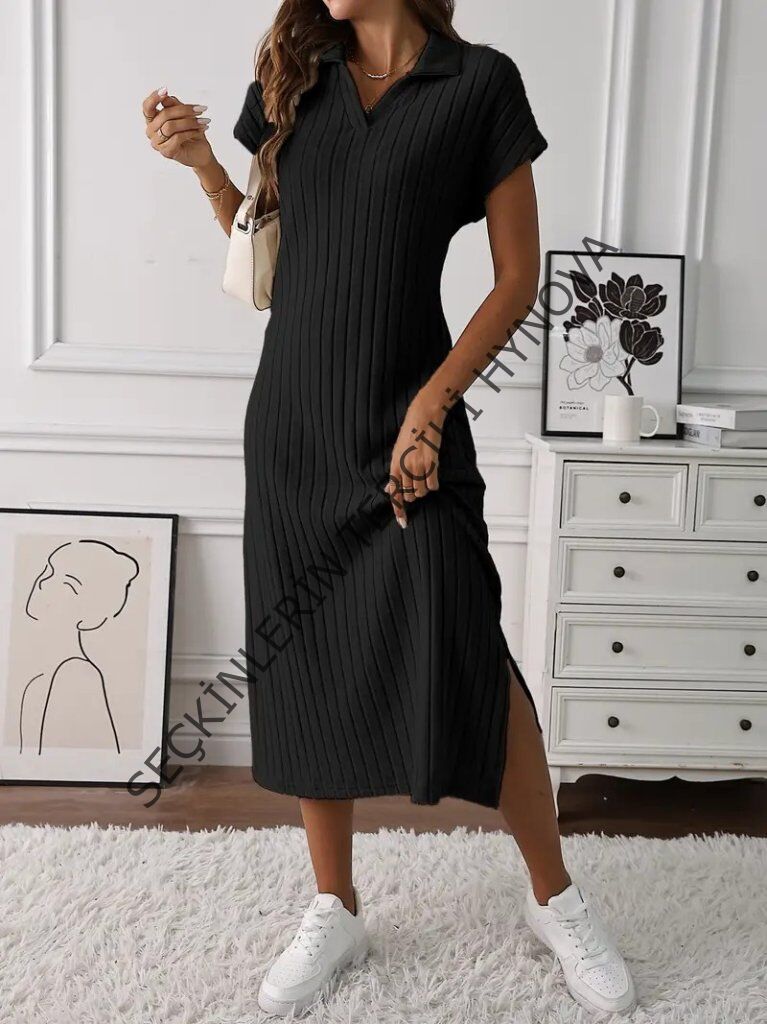 Kadın Kısa Kollu Yakalı Yandan Yırtmaçlı Kalın Fitilli Kaşkorse Elbise