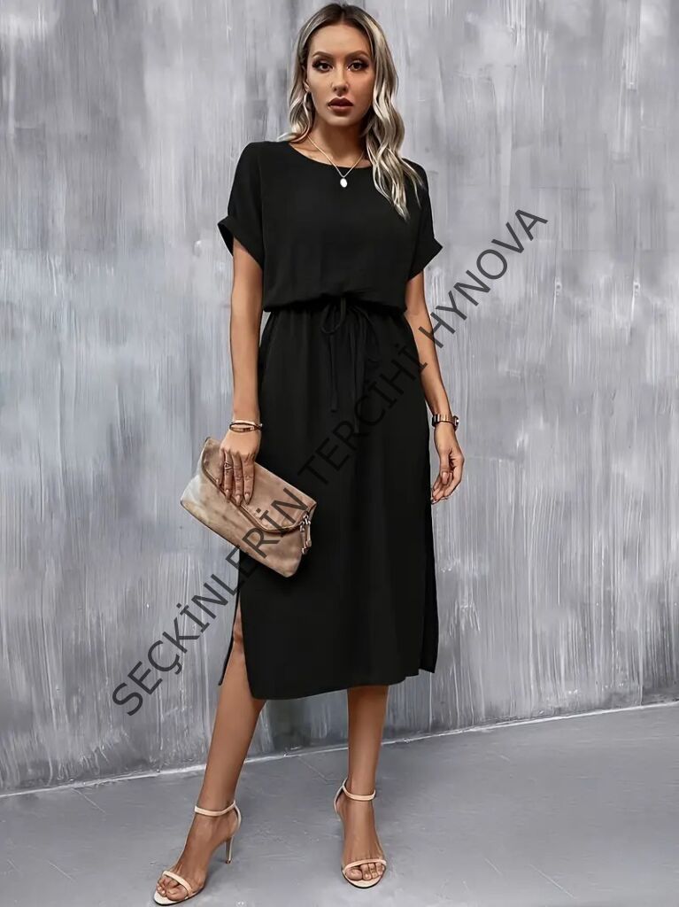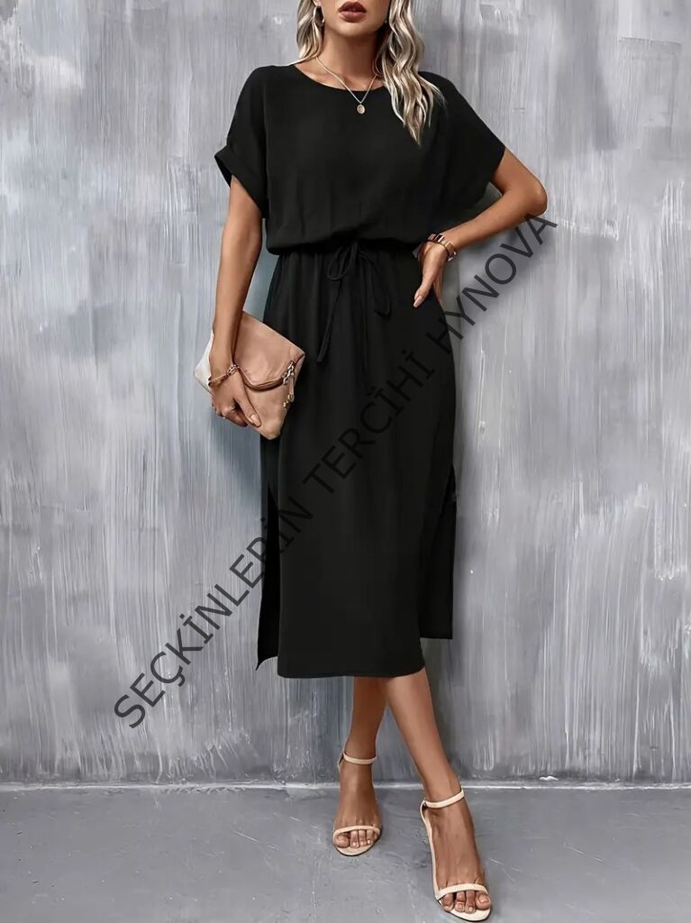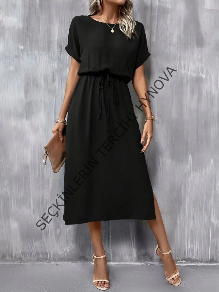 Kadın Kısa Kollu Yakası Açık Belden Bağlamalı Yırtmaçlı Viskon Elbise
