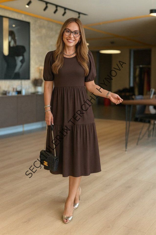 Kadın Kısa Kollu Yakası Açık Katlı Bürümcük Balon Elbise