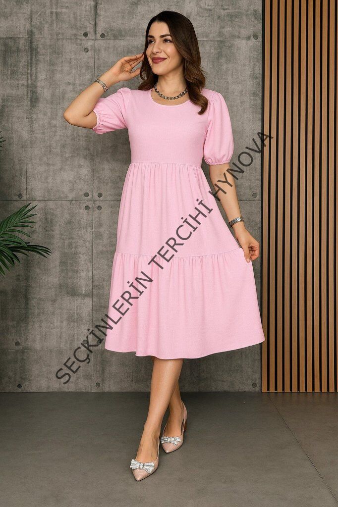Kadın Kısa Kollu Yakası Açık Katlı Bürümcük Balon Elbise