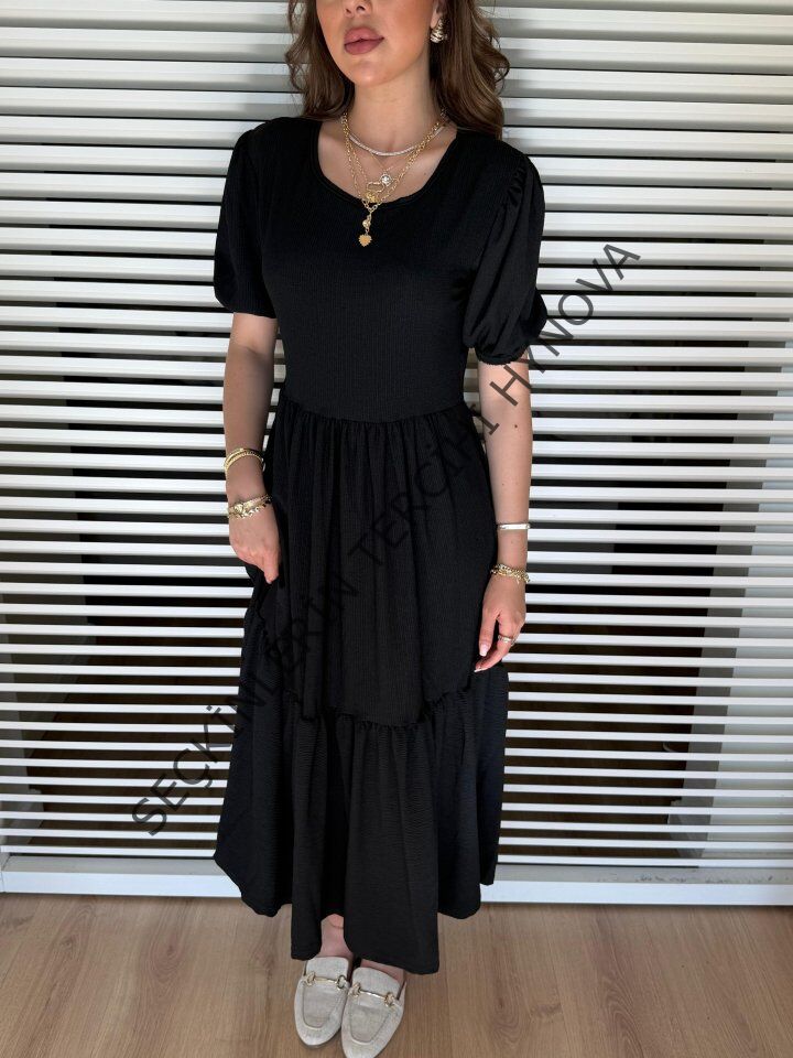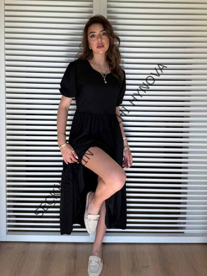 Kadın Kısa Kollu Yakası Açık Katlı Bürümcük Balon Elbise