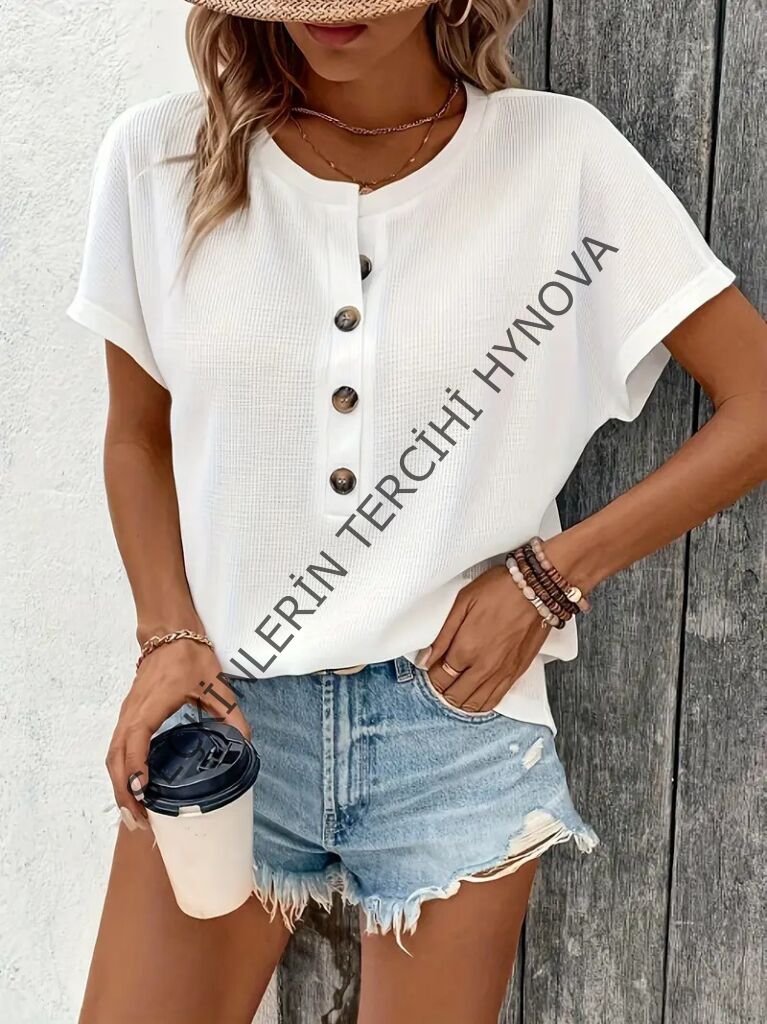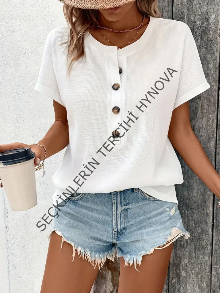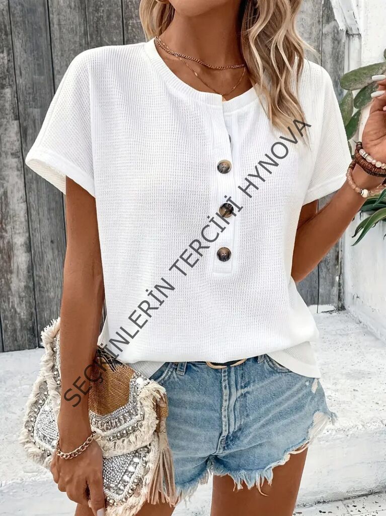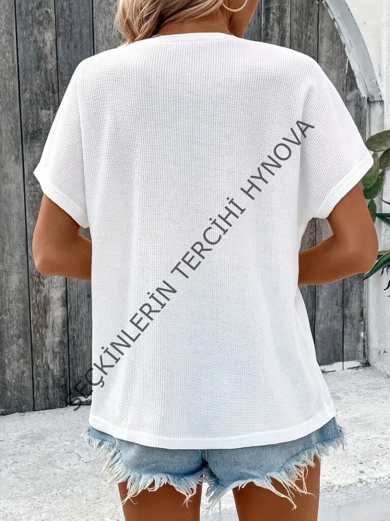 Kadın Kısa Kollu Yakası Açık önden Düğmeli Waffle Bluz