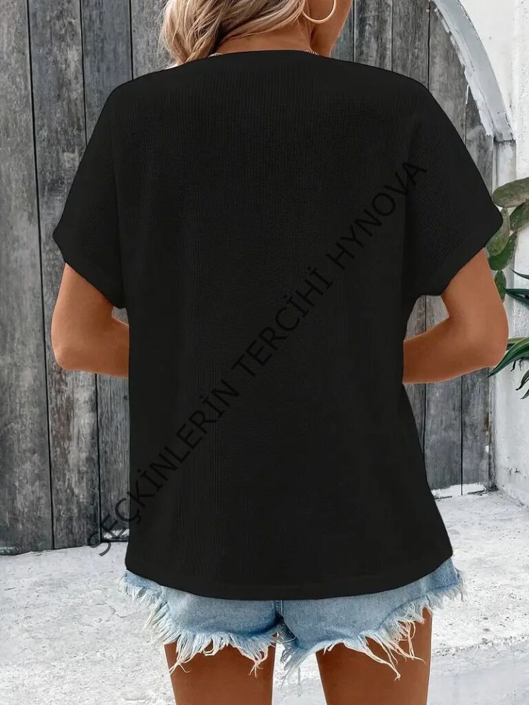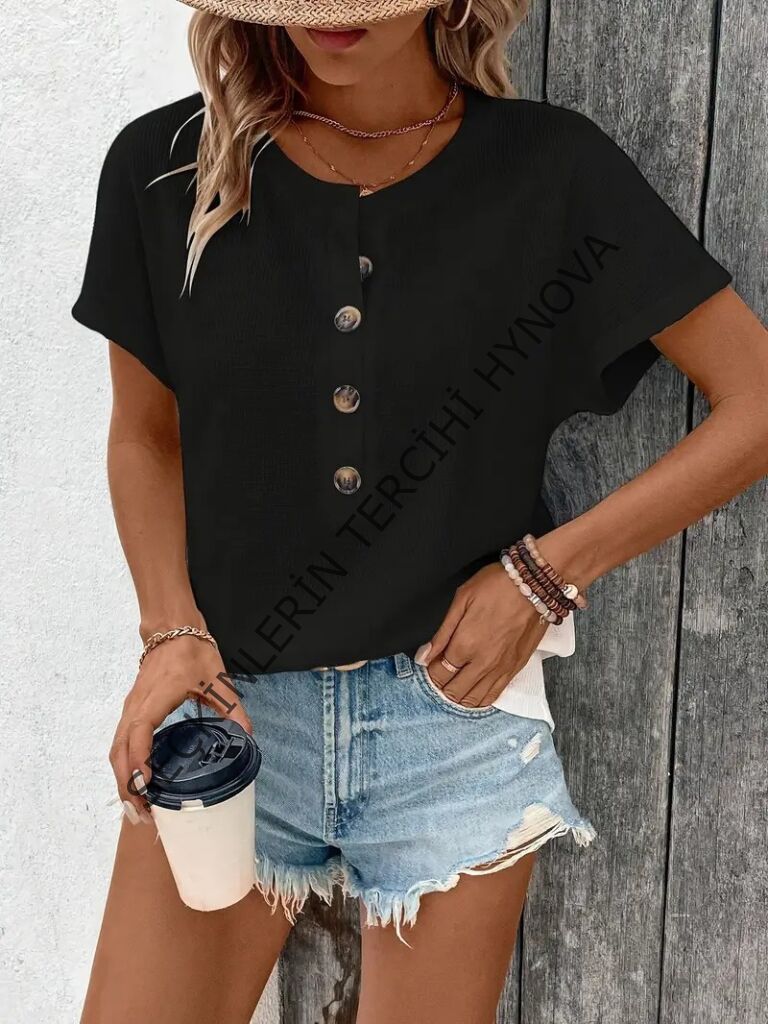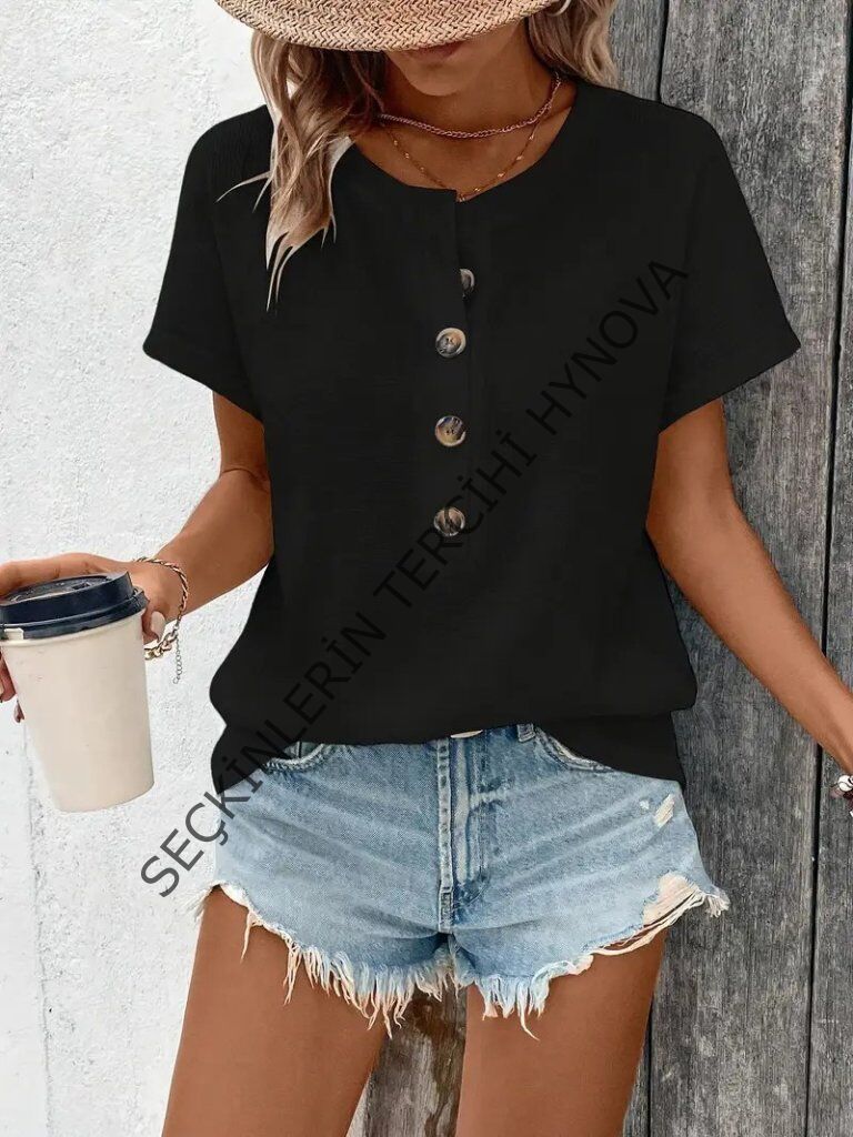 Kadın Kısa Kollu Yakası Açık önden Düğmeli Waffle Bluz