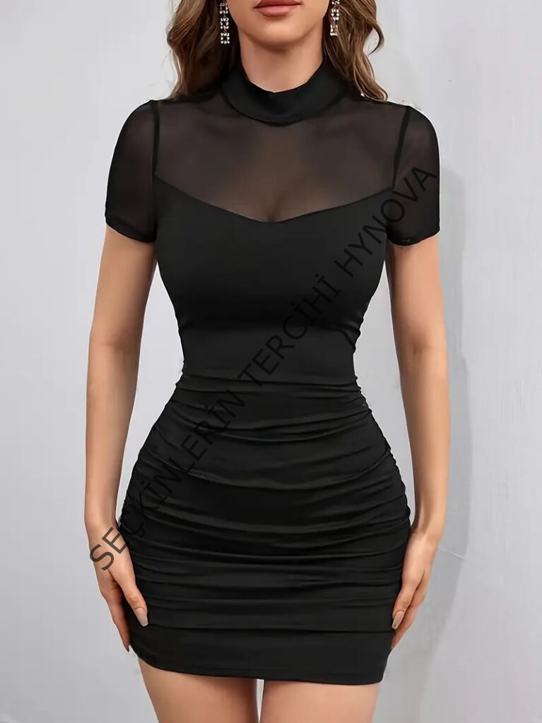 Kadın Kısa Kollu Yarı Balıkçı Yaka Tül Detaylı Kısa Janjan Krep Elbise
