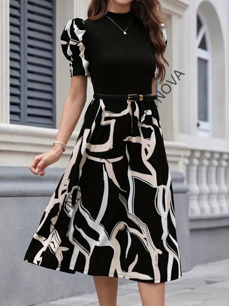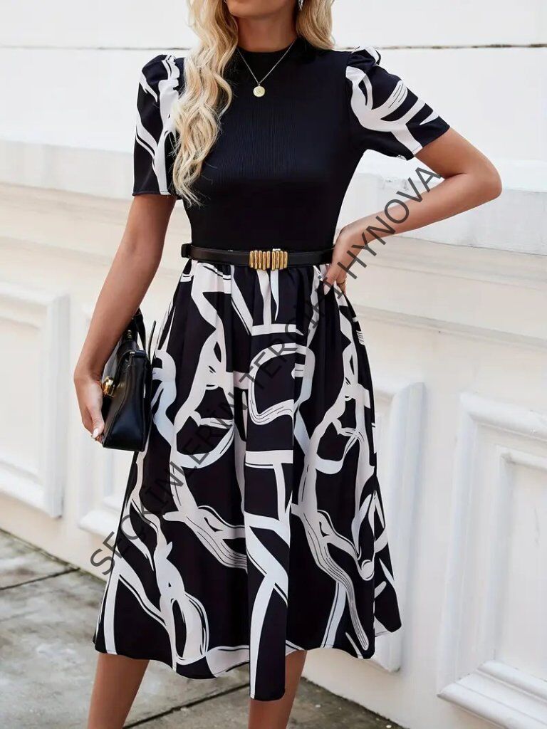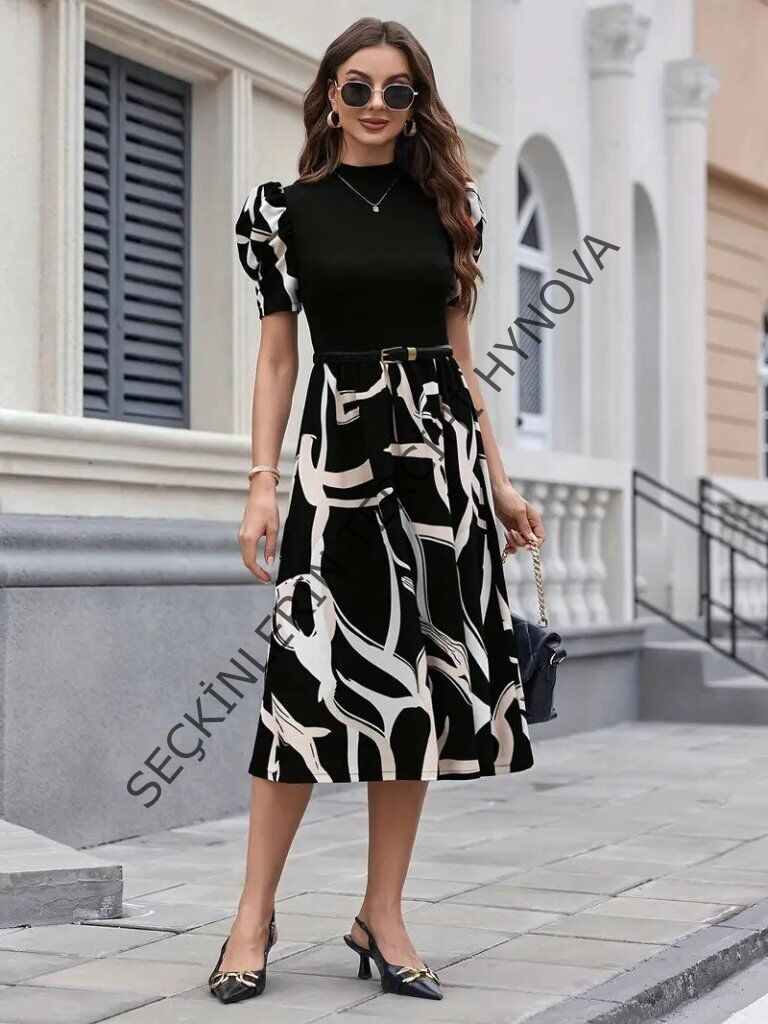 Kadın Kısa Kollu Yarı Balıkçı Yaka üst Viskon Alt Desenli Dokuma Midi Elbise