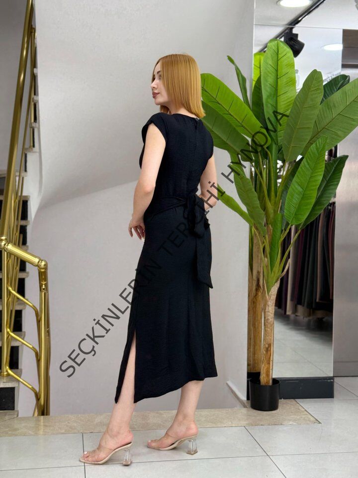 Kadın Kısa Kollu Yuvarlak Yaka Belden Bağcıklı önden Yırtmaçlı Aerobin Elbise