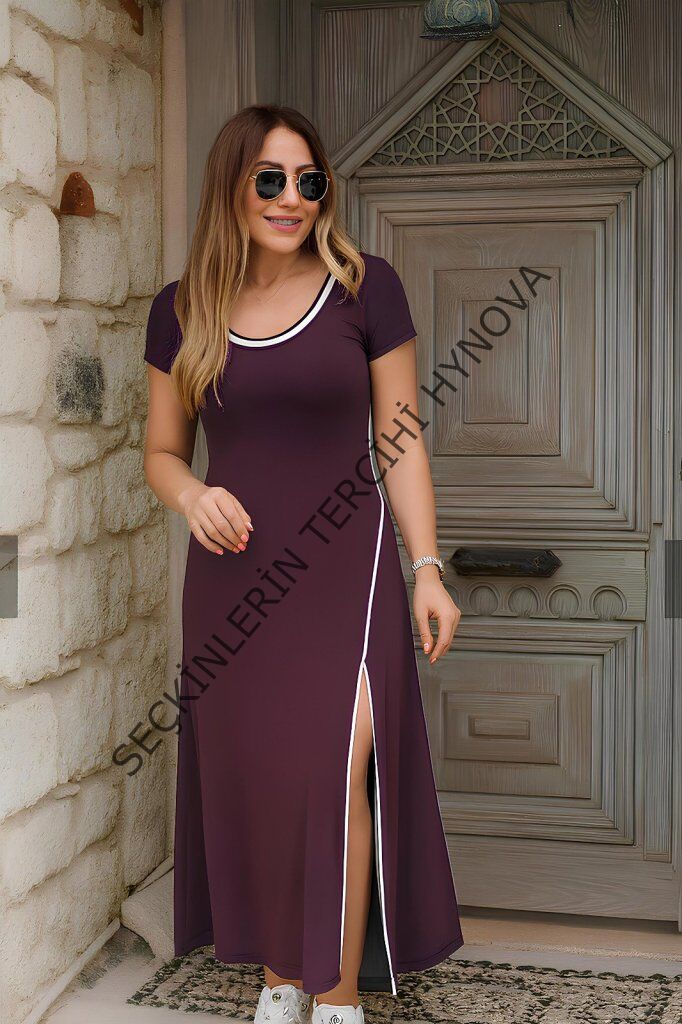 Kadın Kısa Kollu Yuvarlak Yaka Beyaz Yırtmaç Detaylı Viskon Tam Boy Elbise