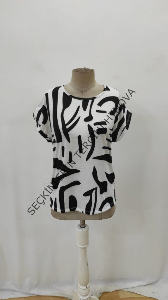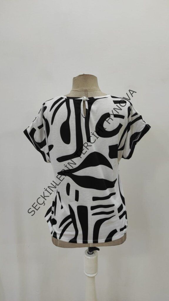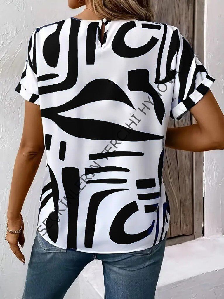 Kadın Kısa Kollu Yuvarlak Yaka Desenli Süprem Bluz