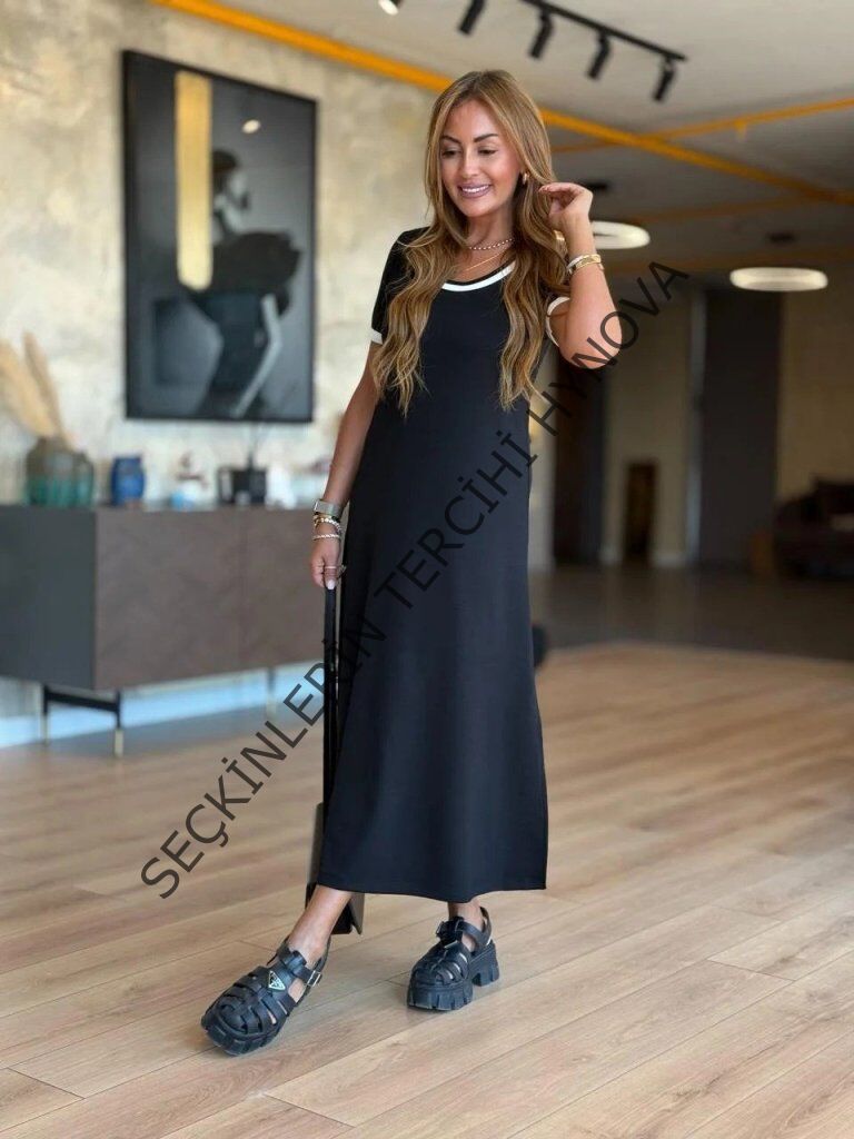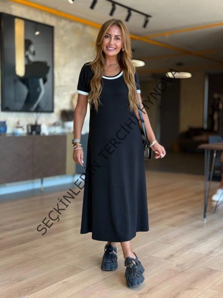 Kadın Kısa Kollu Yuvarlak Yaka Yandan Yırtmaçlı Midi Viskon Elbise