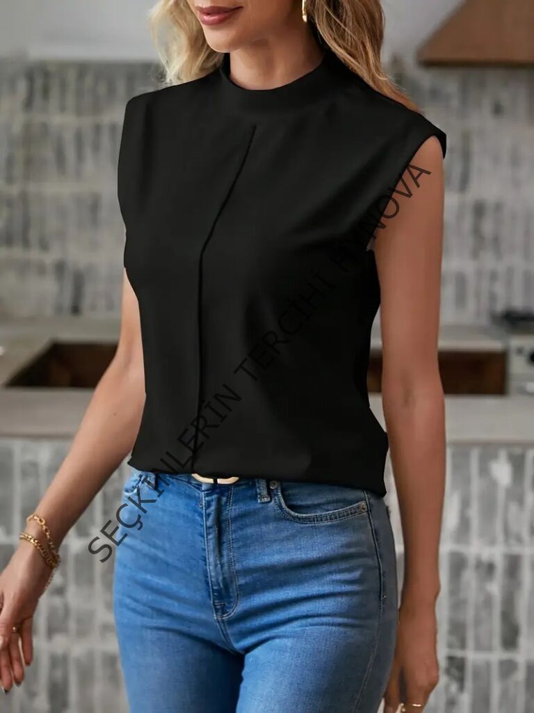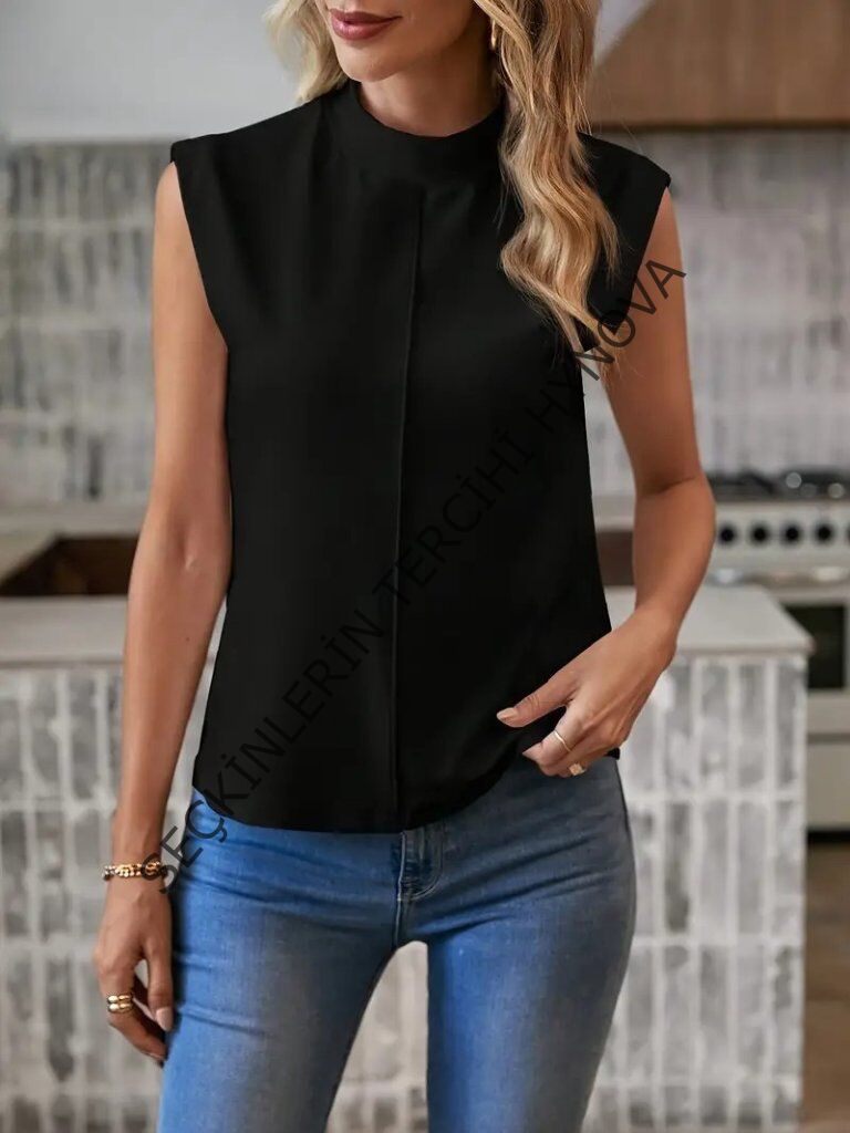 Kadın Kısa Reglan Kollu Yarı Balıkçı Yaka Ithal Krep Bluz