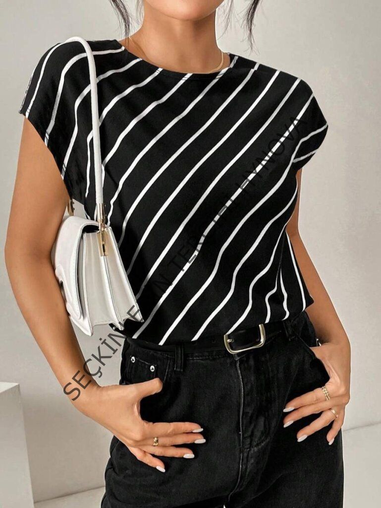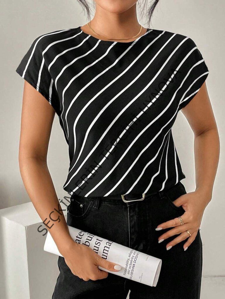 Kadın Kısa Yarasa Kollu Bisiklet Yaka çizgi Desenli Atlas Bluz