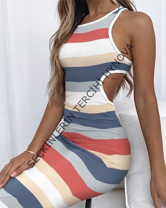 Kadın Kolsuz Bel Dekolte Detay şerit Desenli Pegasus Kumaş Elbise