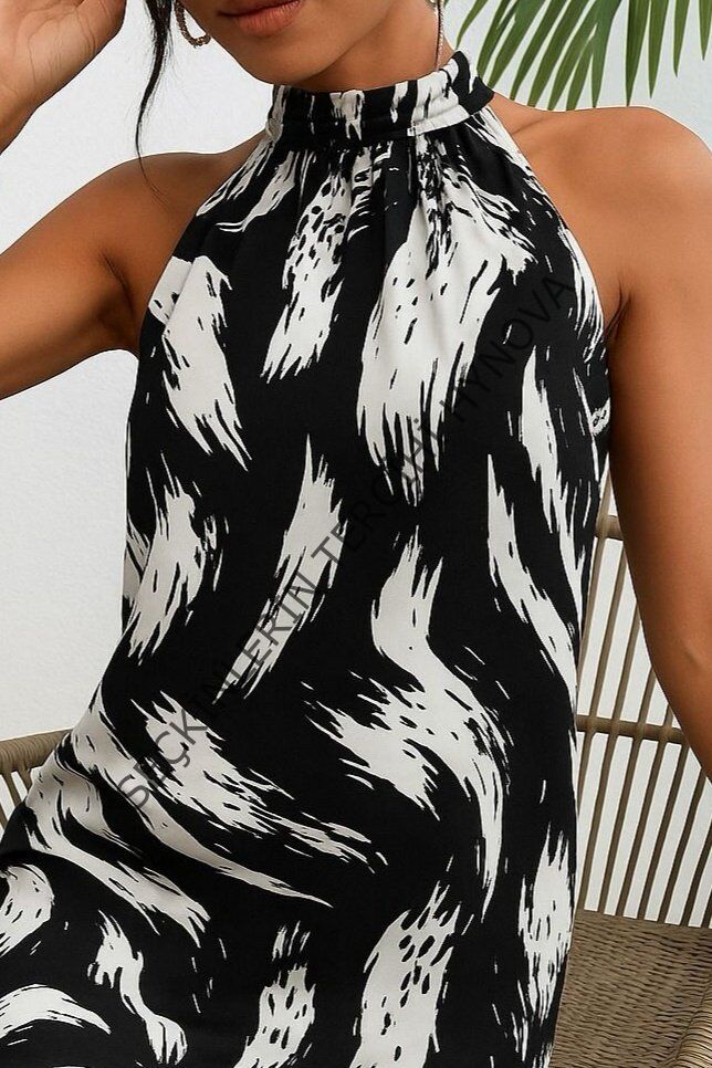 Kadın Kolsuz Boyundan Askılı Desenli Midi Süprem Elbise