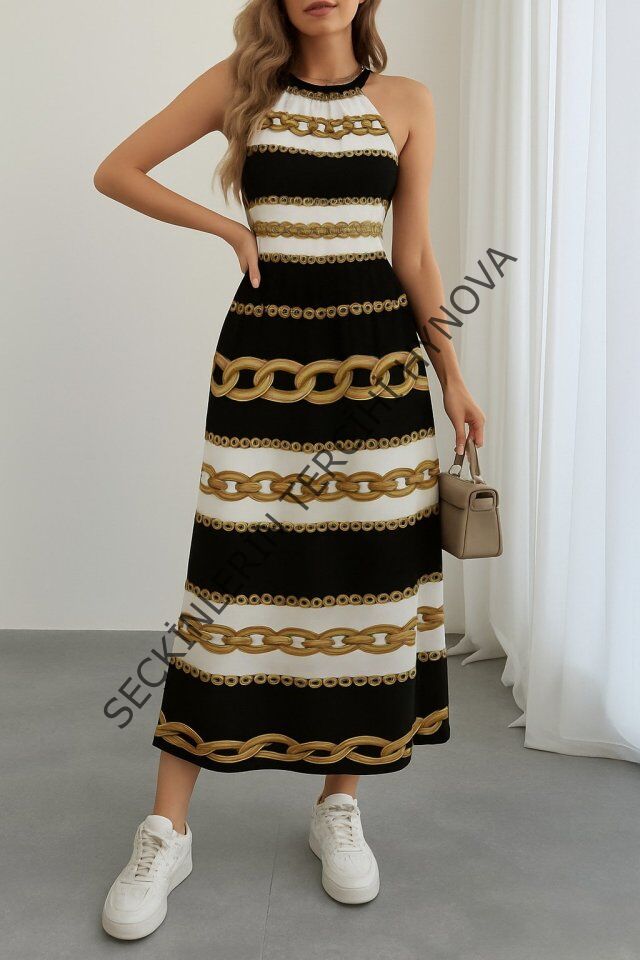 Kadın Kolsuz Boyundan Bağlamalı Beli Lastikli Dijital Baskı Süprem Uzun Elbise