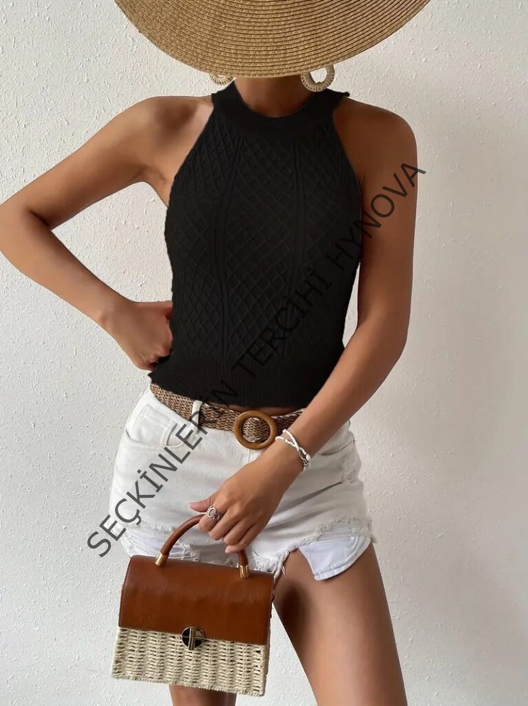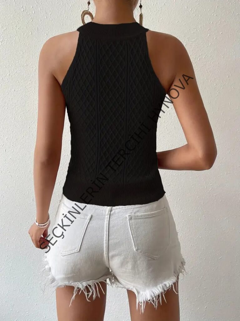 Kadın Kolsuz Halter Yaka Mini Baklava Desenli Triko Bluz