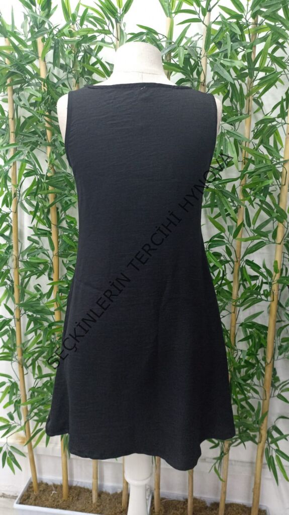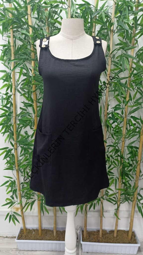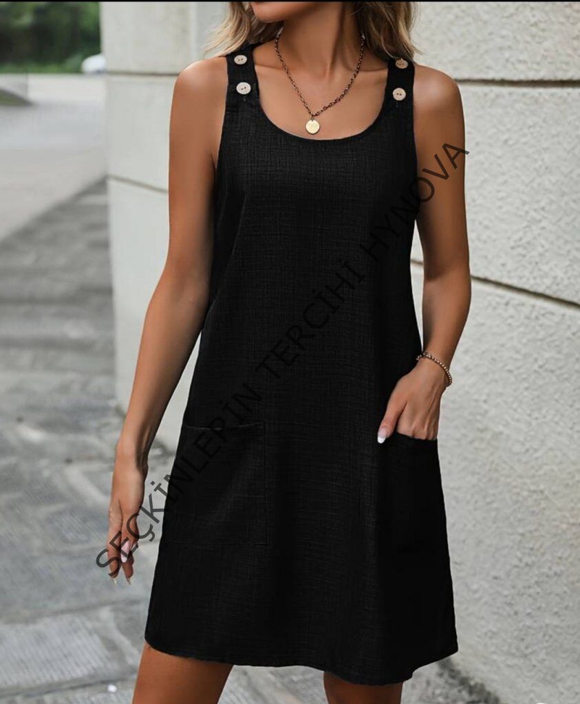 Kadın Kolsuz Kalın Askılı Düğme Detay Cepli Keten Elbise