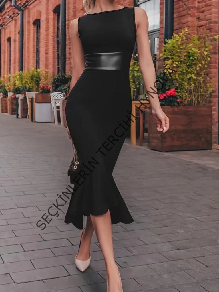 Kadın Kolsuz Kayık Yaka Beli Deri Detaylı Krep Elbise