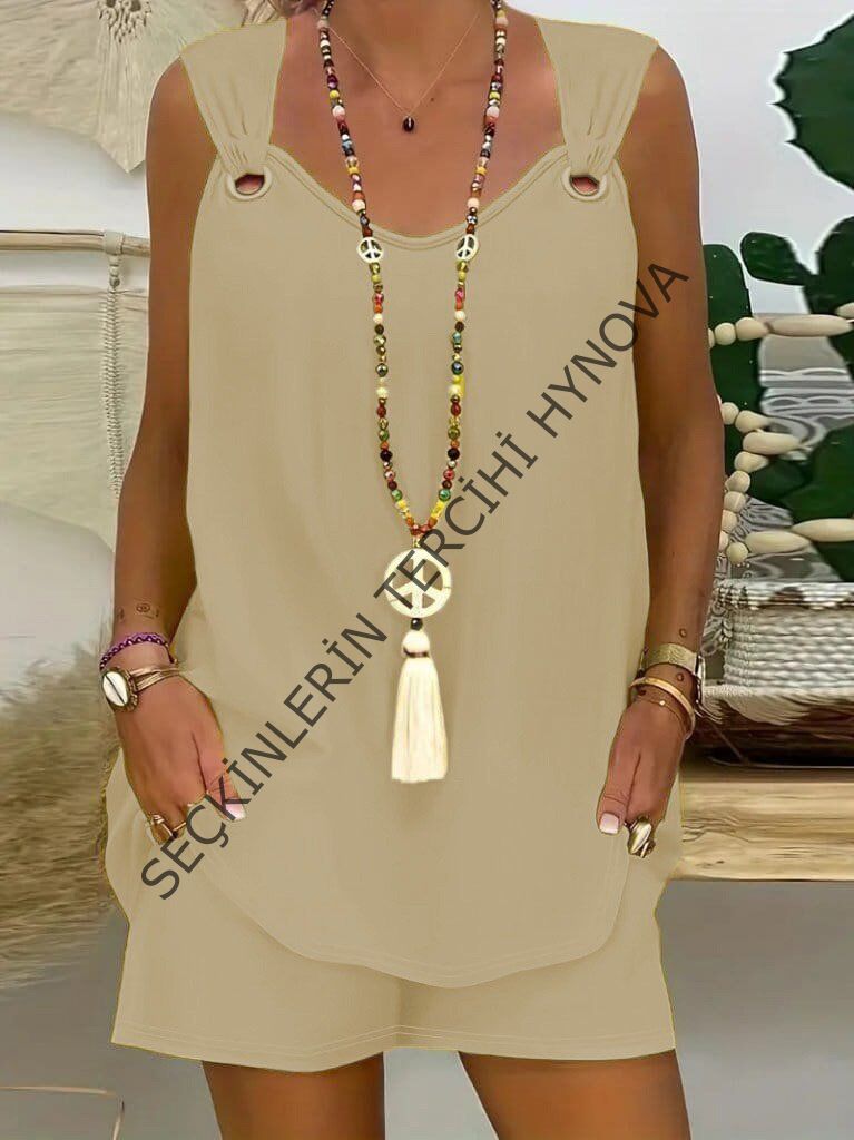 Kadın Kolsuz V Yaka Kuş Gözü Detay Bluz Short Aerobin Ikili Takım