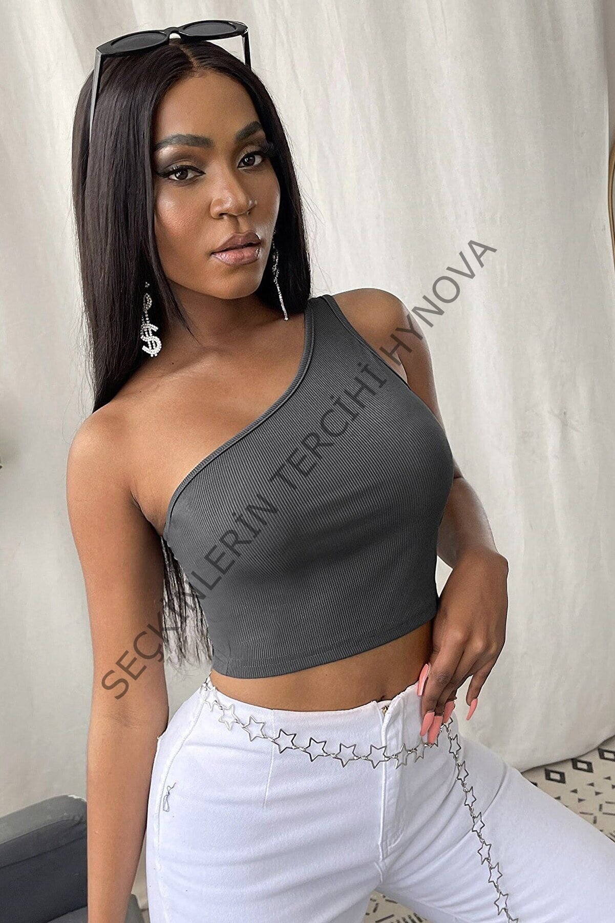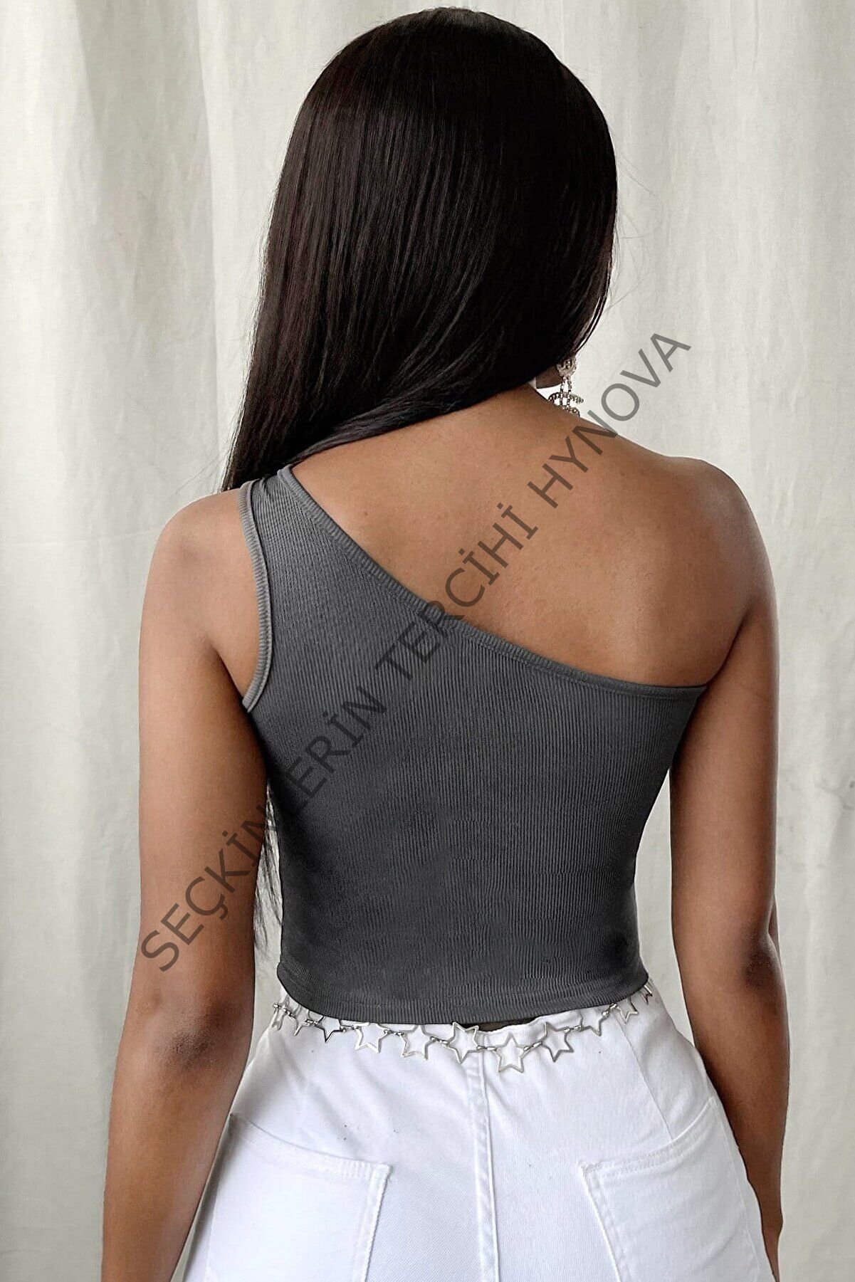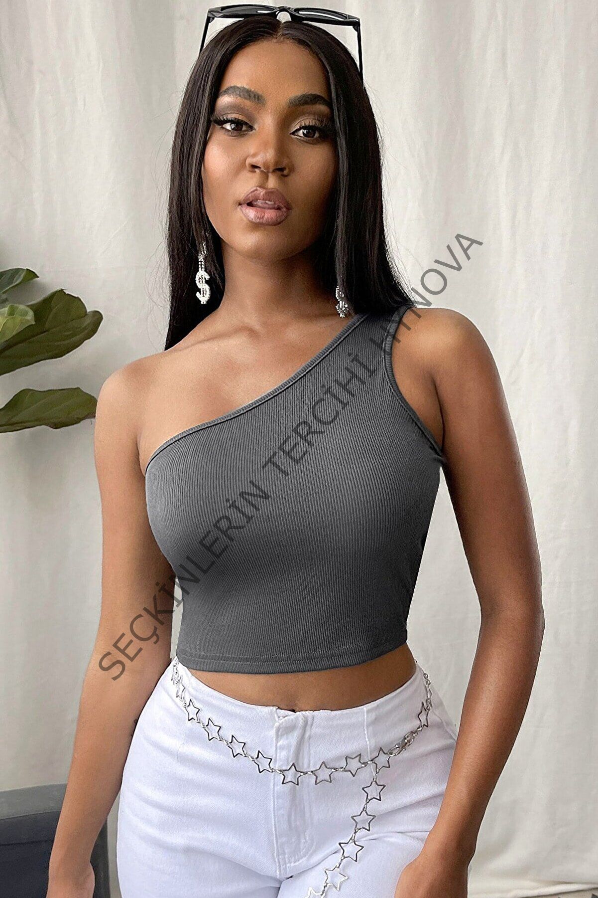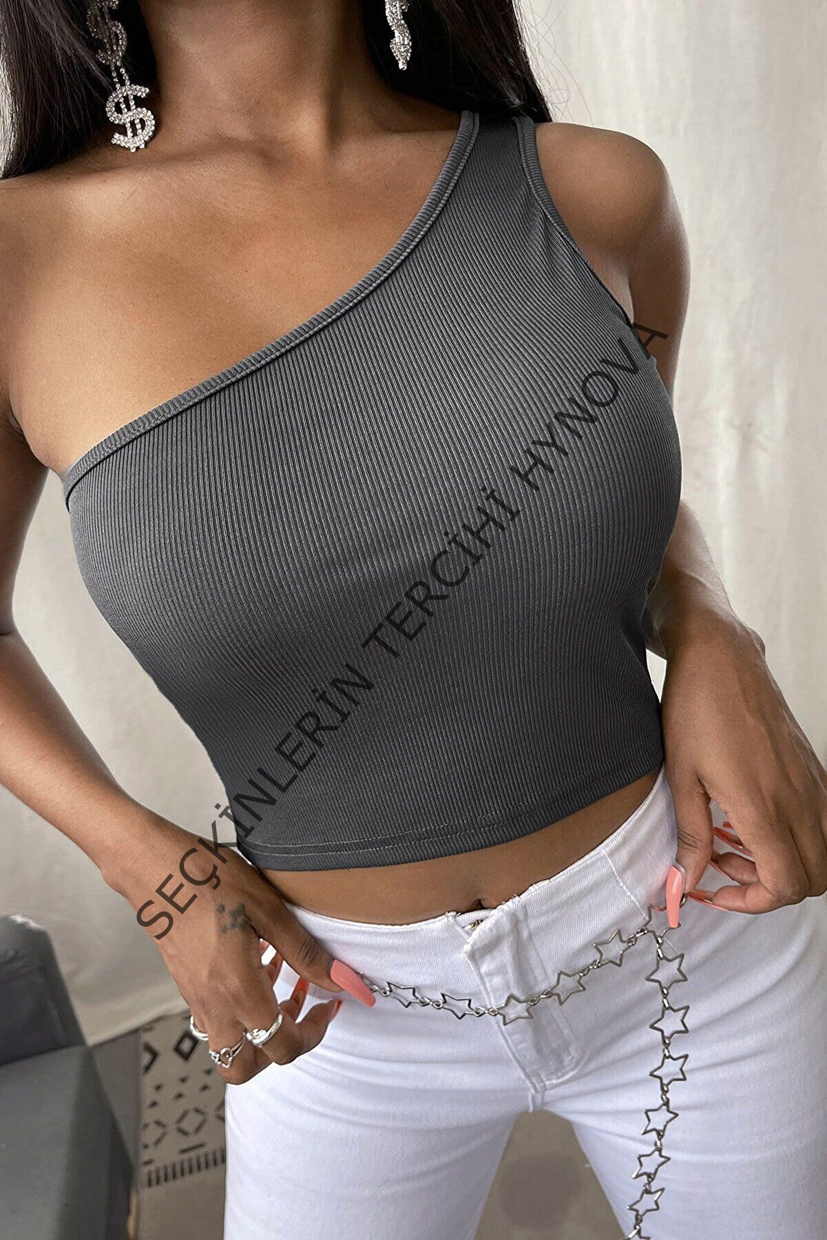 Kadın Koyu Gri Tek Omuz Crop Büstiyer – Modern ve Şık Tasarım
