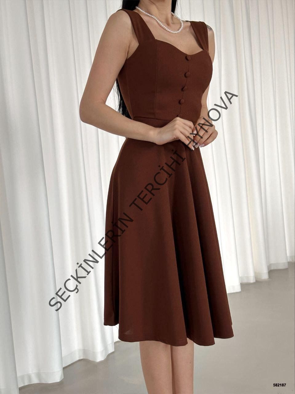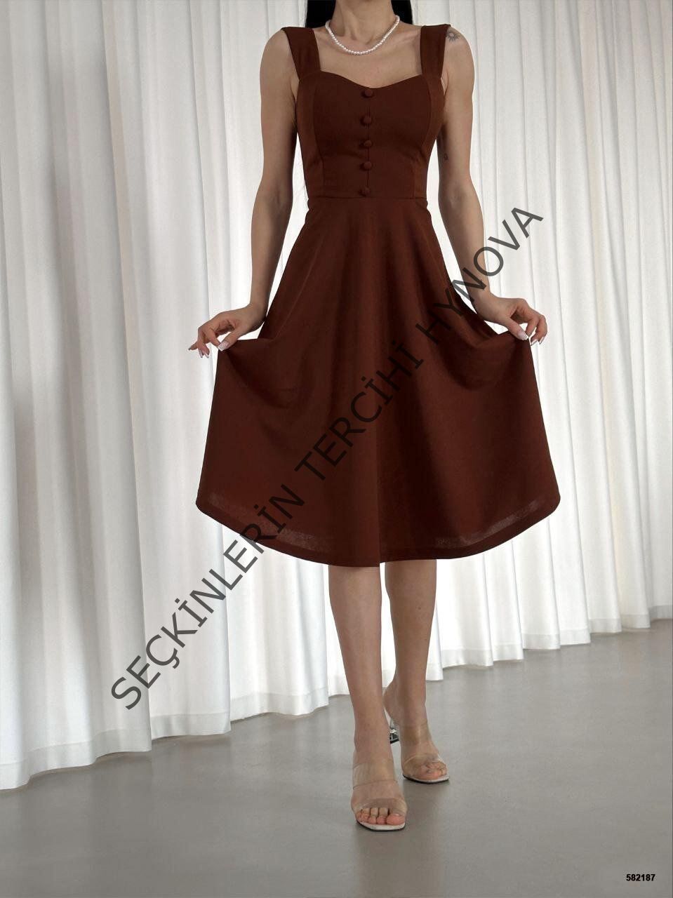 Kadın Krep Kumaş Askılı Kalp Yaka Düğme Detay Midi Boy Elbise