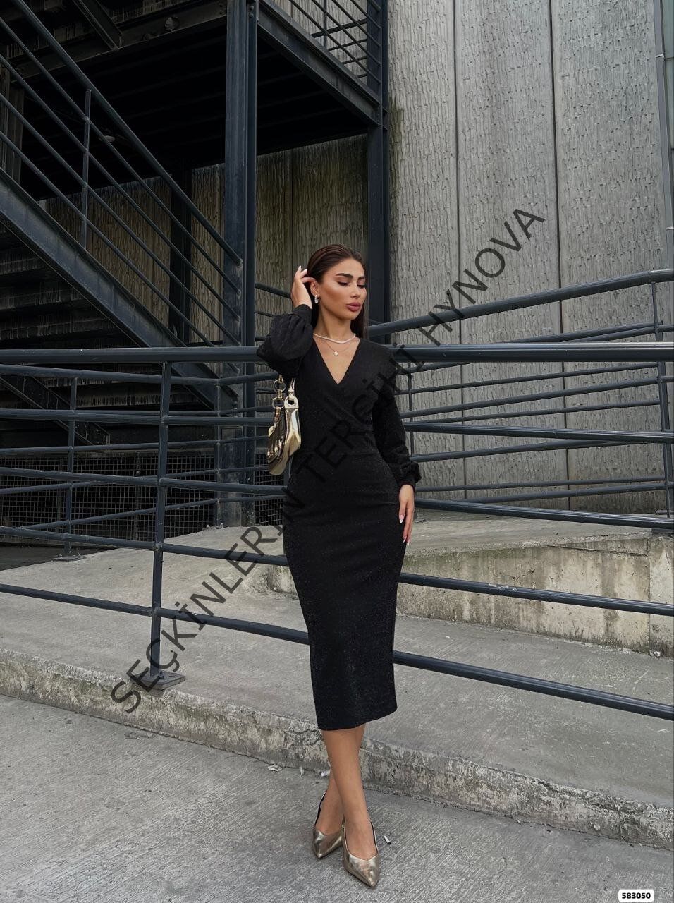 Kadın Kruvaze Yaka Balon Kol Simli Krep Kumaş Midi Boy Elbise