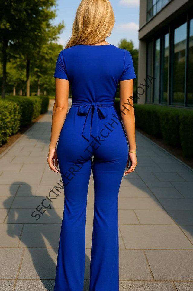 Kadın Kruvaze Yaka Kısa Kollu Kuşaklı Tulum