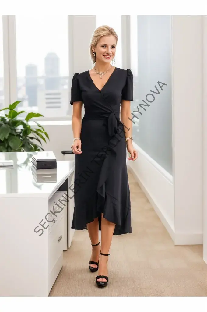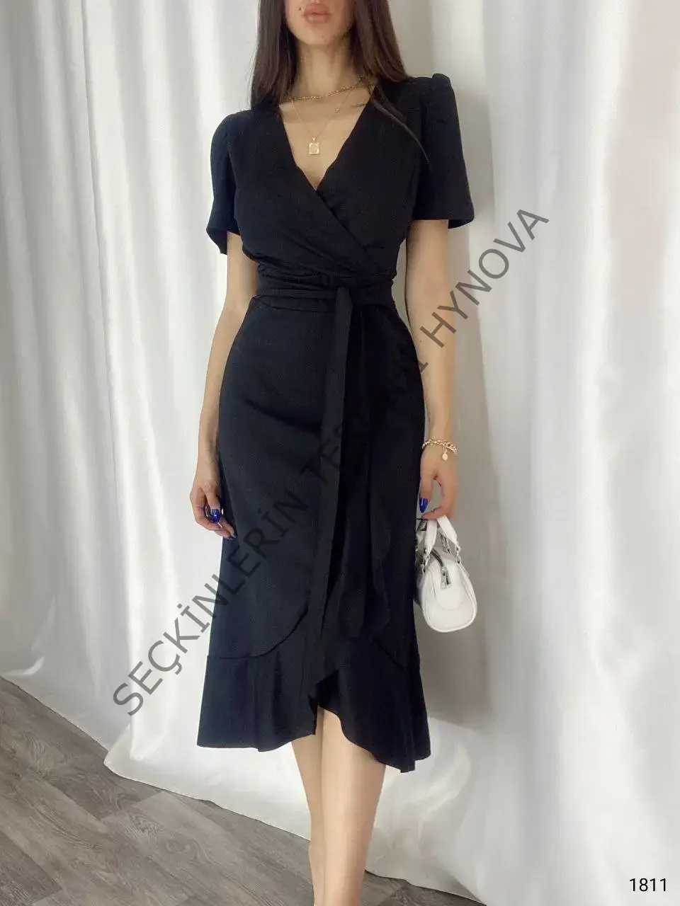 Kadın Kruvaze Yaka Midi Boy Kuşaklı Krep Elbise 120 Cm