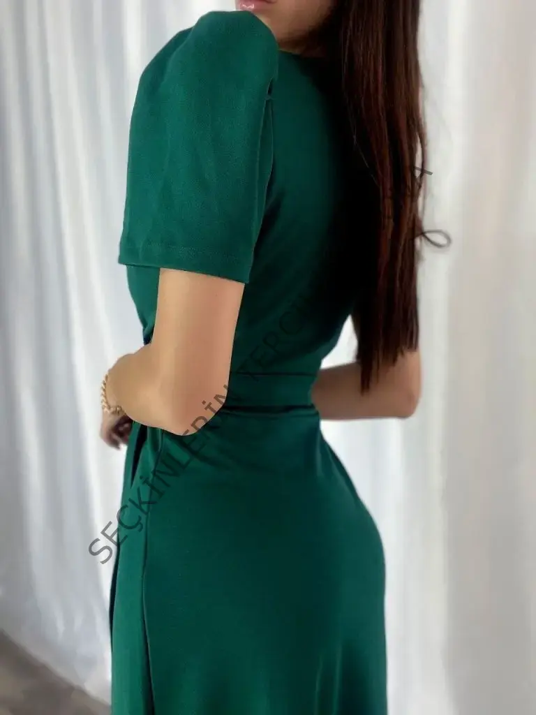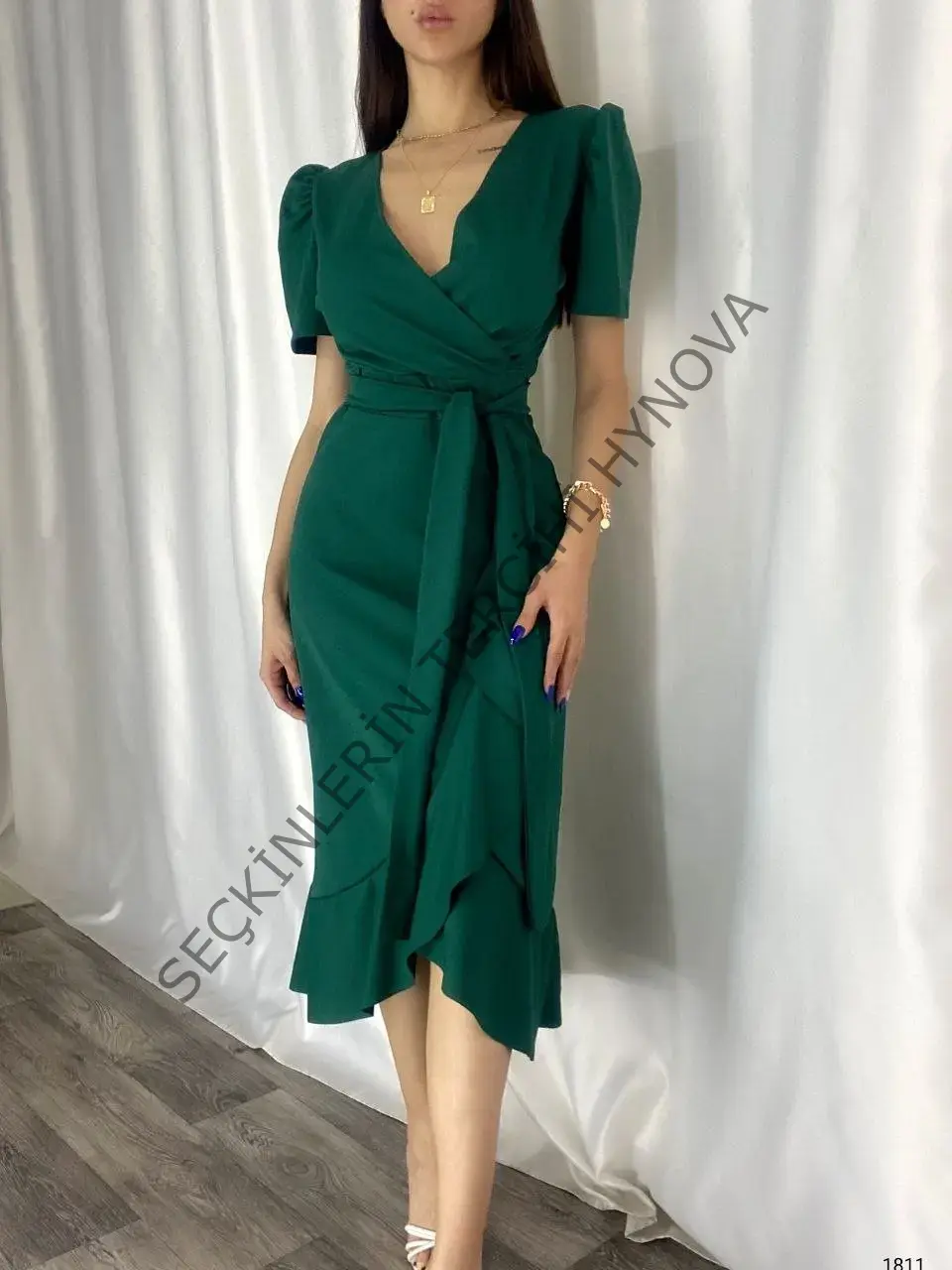 Kadın Kruvaze Yaka Midi Boy Kuşaklı Krep Elbise 120 Cm