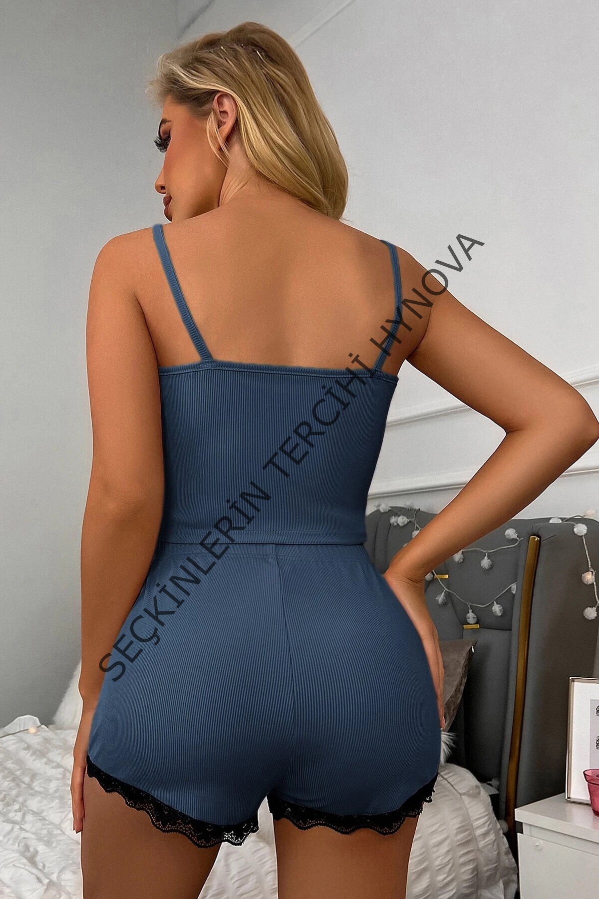 Kadın Lacivert Alt Ve Üst Dantel Detaylı Şortlu Gecelik Takımı – Modern, Konforlu ve Günlük Kombinlere Uygun