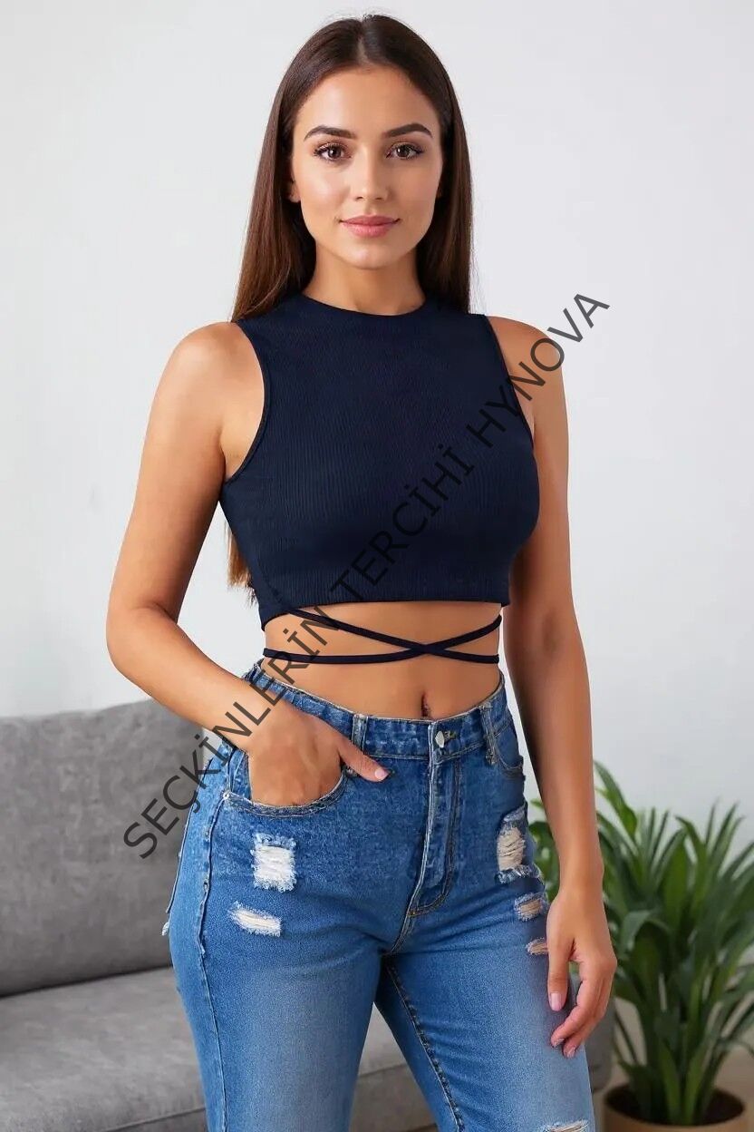 Kadın Lacivert Çapraz Bağlamalı Crop Top Büstiyer – Modern ve Şık Tasarım