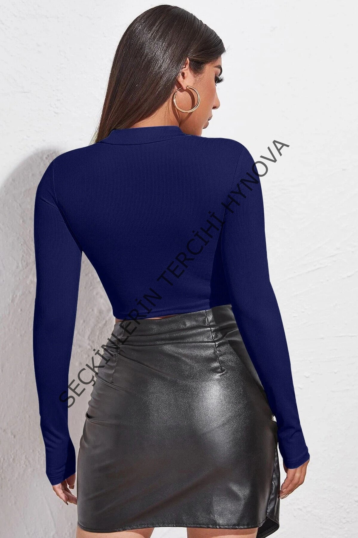 Kadın Lacivert Göğüs Dekolteli Uzun Kollu Cut Out Crop Top Bluz – Şık, Rahat ve Kolay Kombinlenebilir