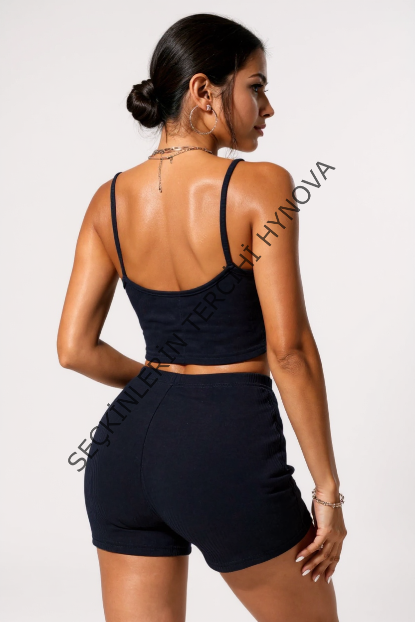 Kadın Lacivert Şortlu Kaşkorse Gecelik Takım – Modern, Konforlu ve Günlük Kombinlere Uygun