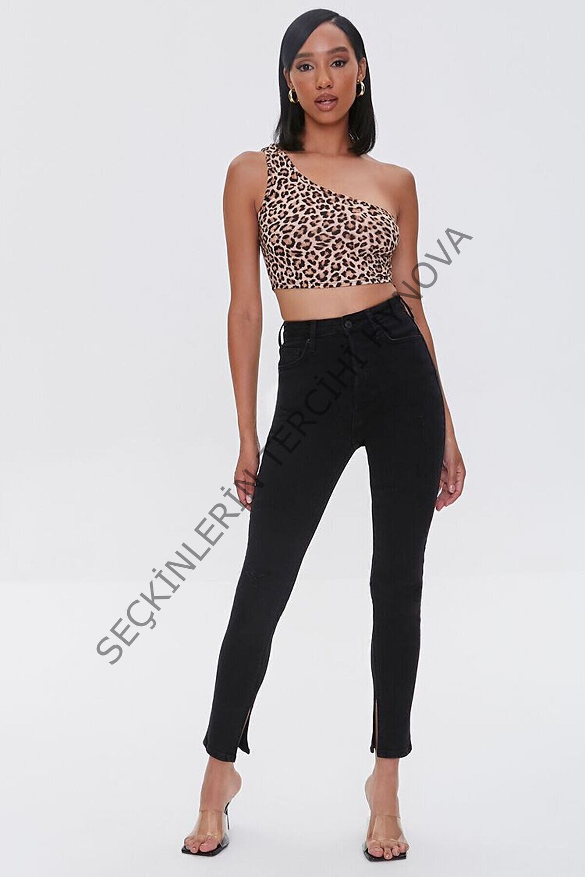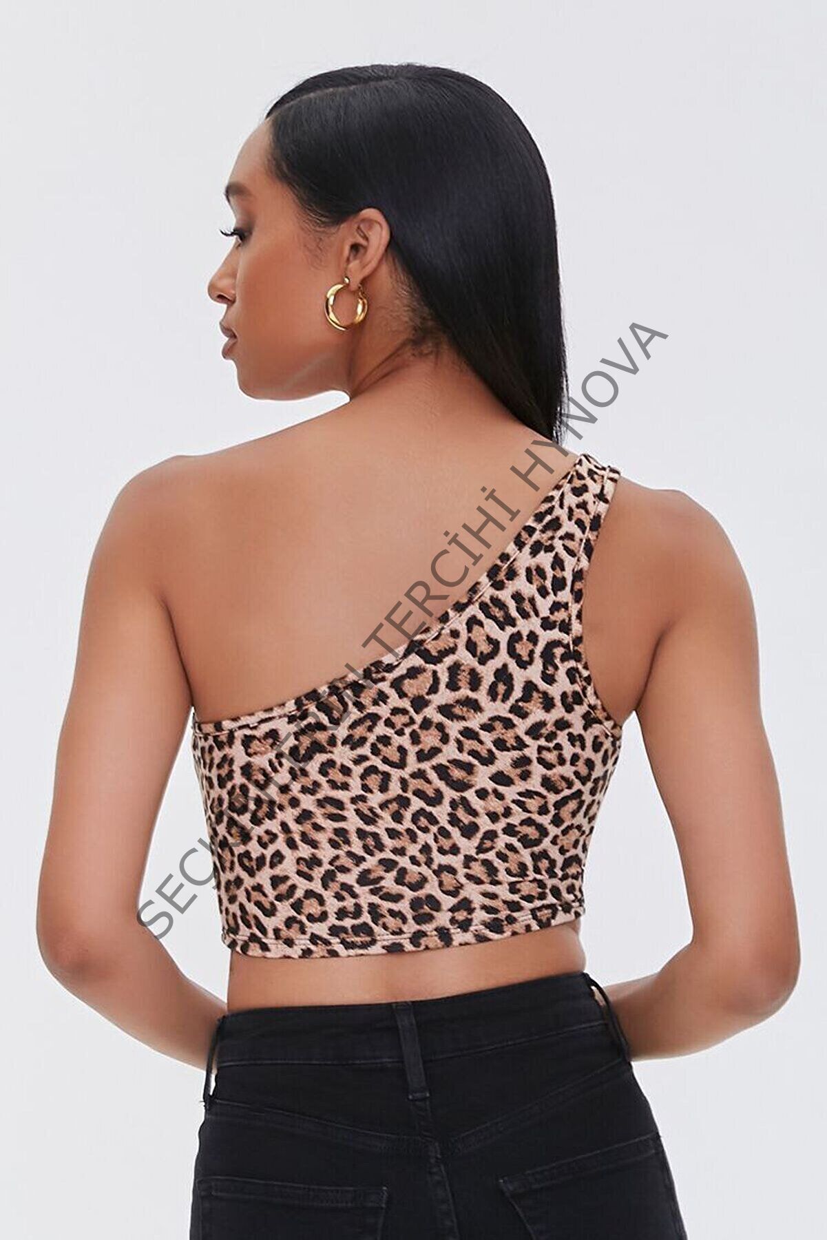 Kadın Leopar Desenli Tek Omuz Crop Büstiyer
