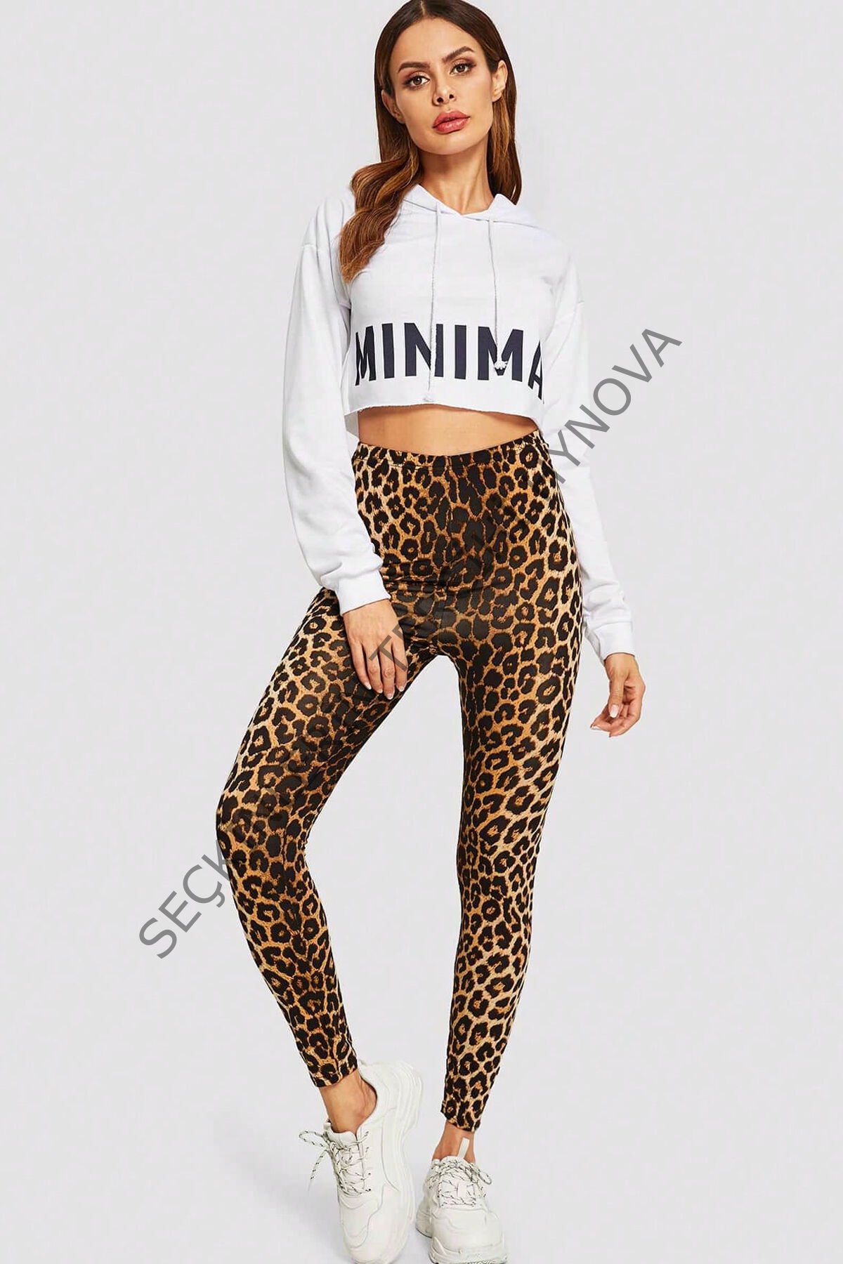 - Leopar deseniyle dikkat çeken yüksek bel dar tayt, spor şıklığınızı tamamlar.