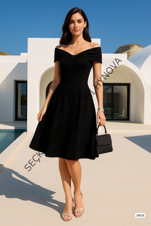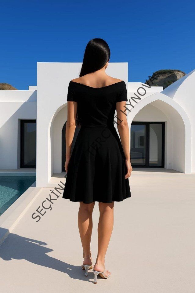 Kadın Madonna Yaka Pliseli Scuba Krep Kumaş Diz üstü Elbise