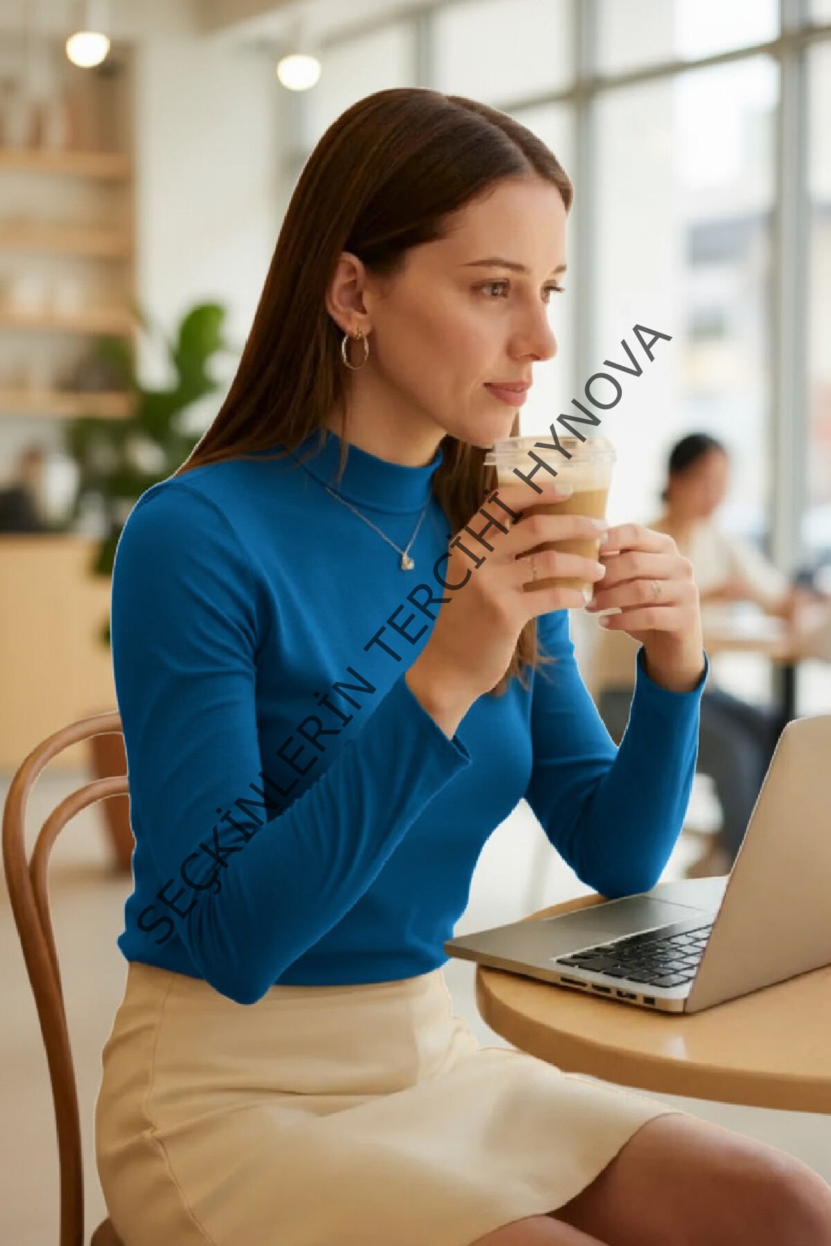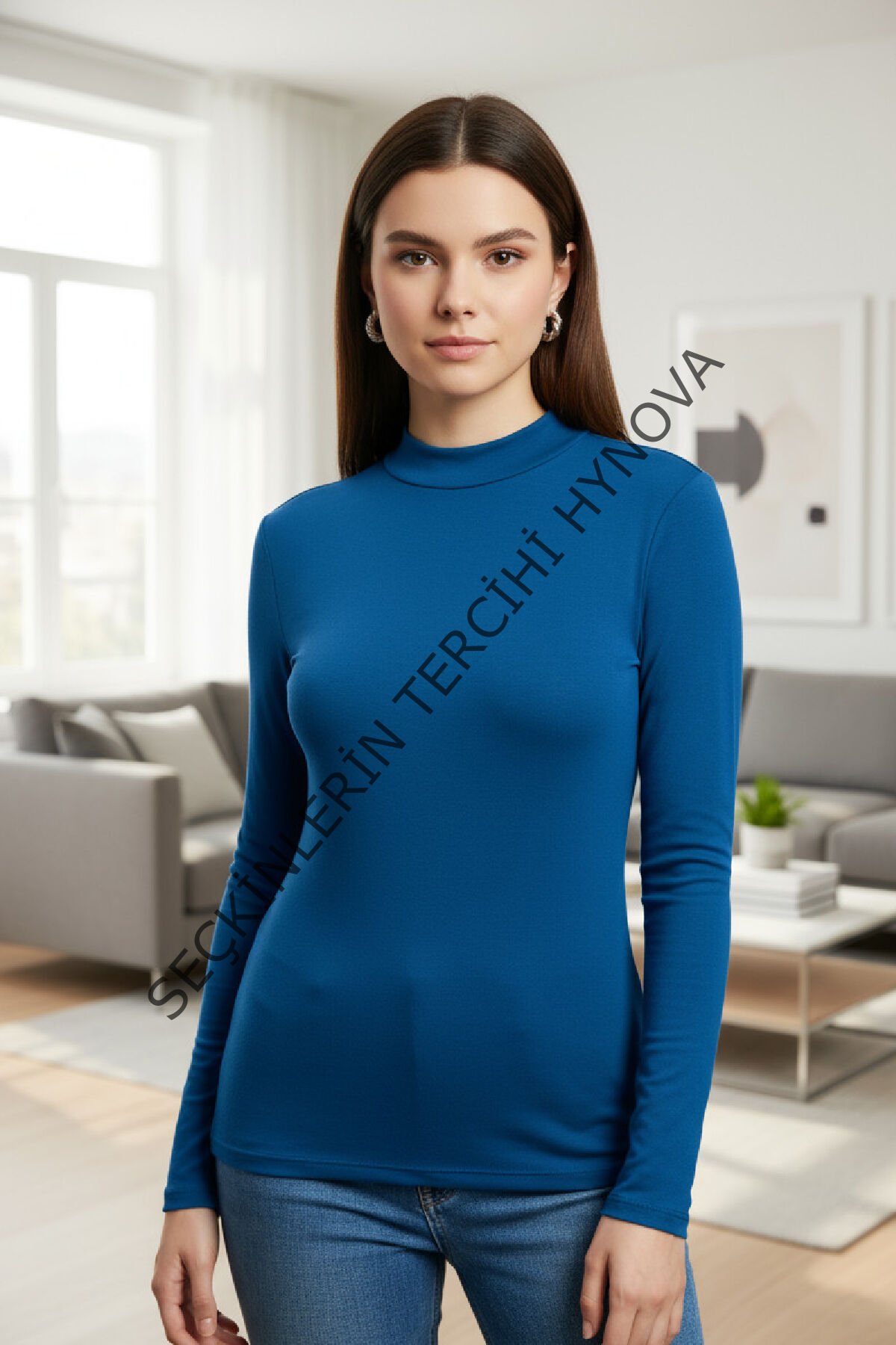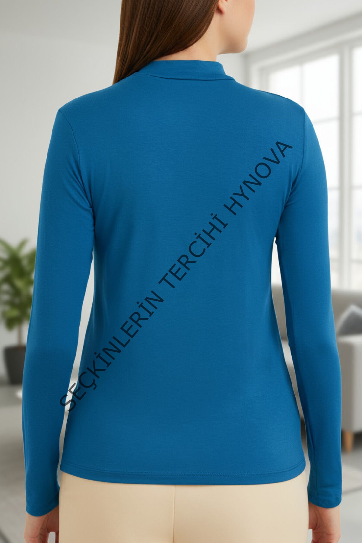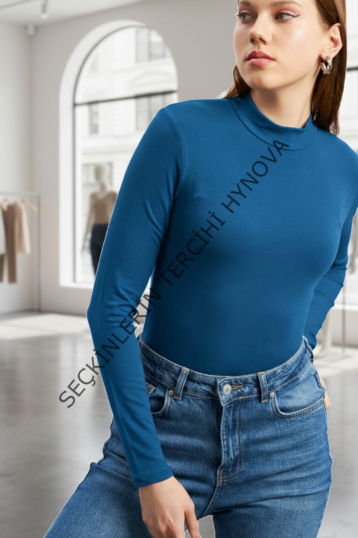 Kadın Mavi Parmak Detaylı Esnek Uzun Kollu Body