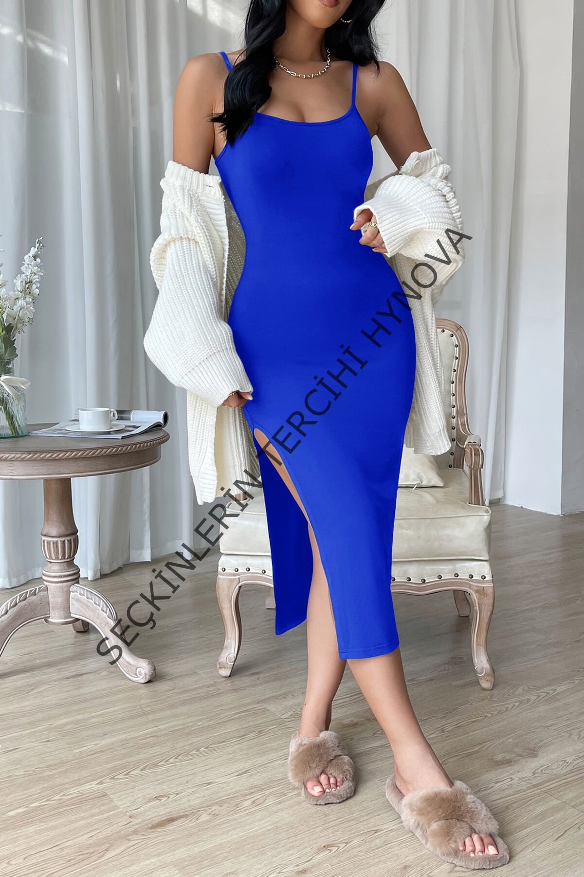Kadın Mavi Yırtmaçlı Diz Altı Vücüdu Saran Gecelik