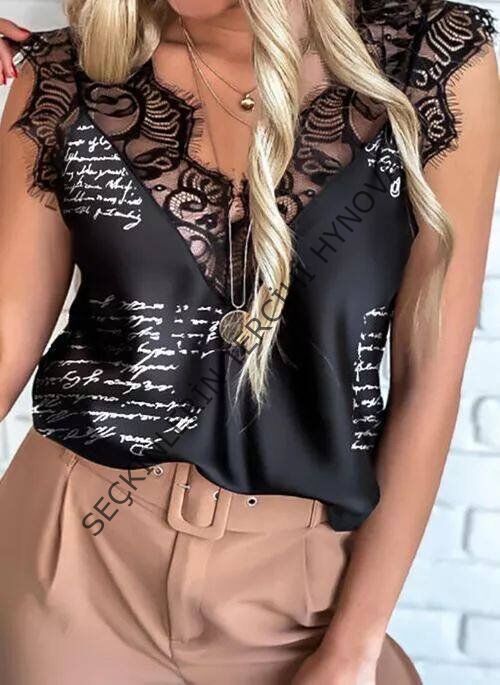 Kadın Mektup Desenli Dantel Detaylı Mikro Kumaş Bluz