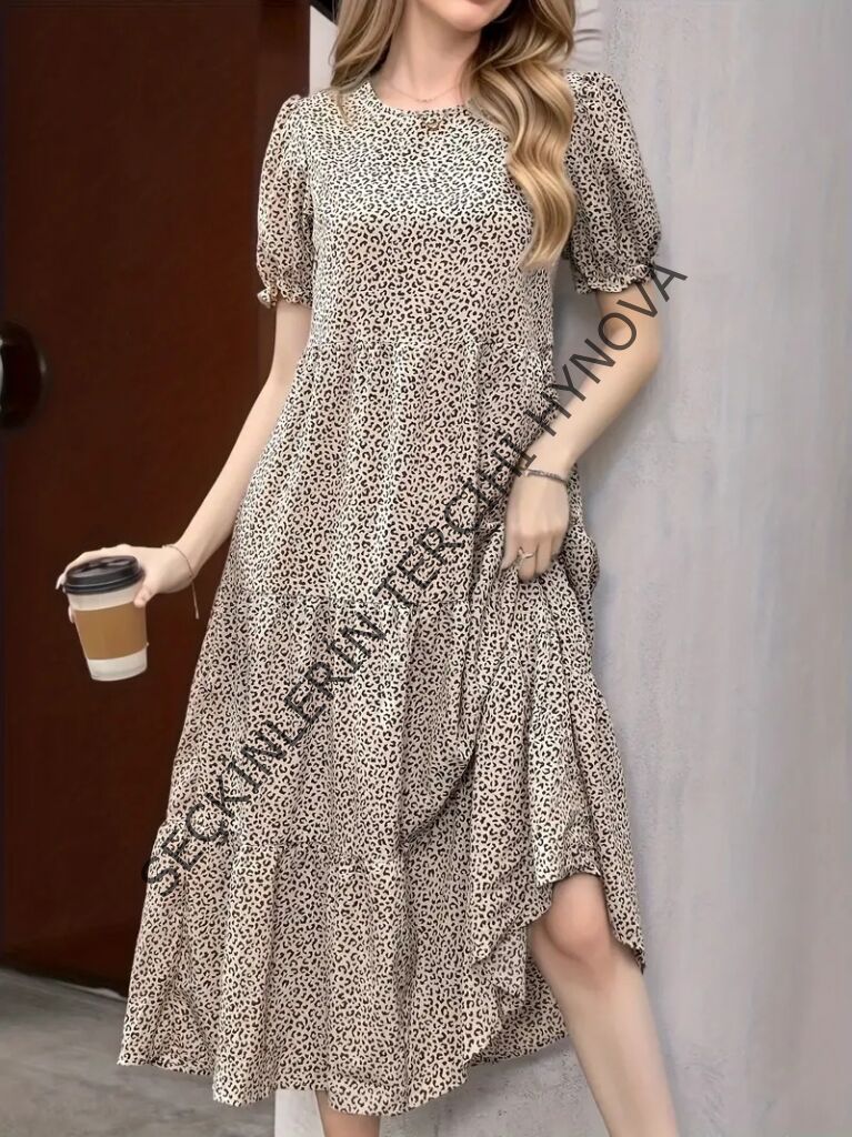 Kadın Mini Leopar Desen Midi üç Kat Elbise