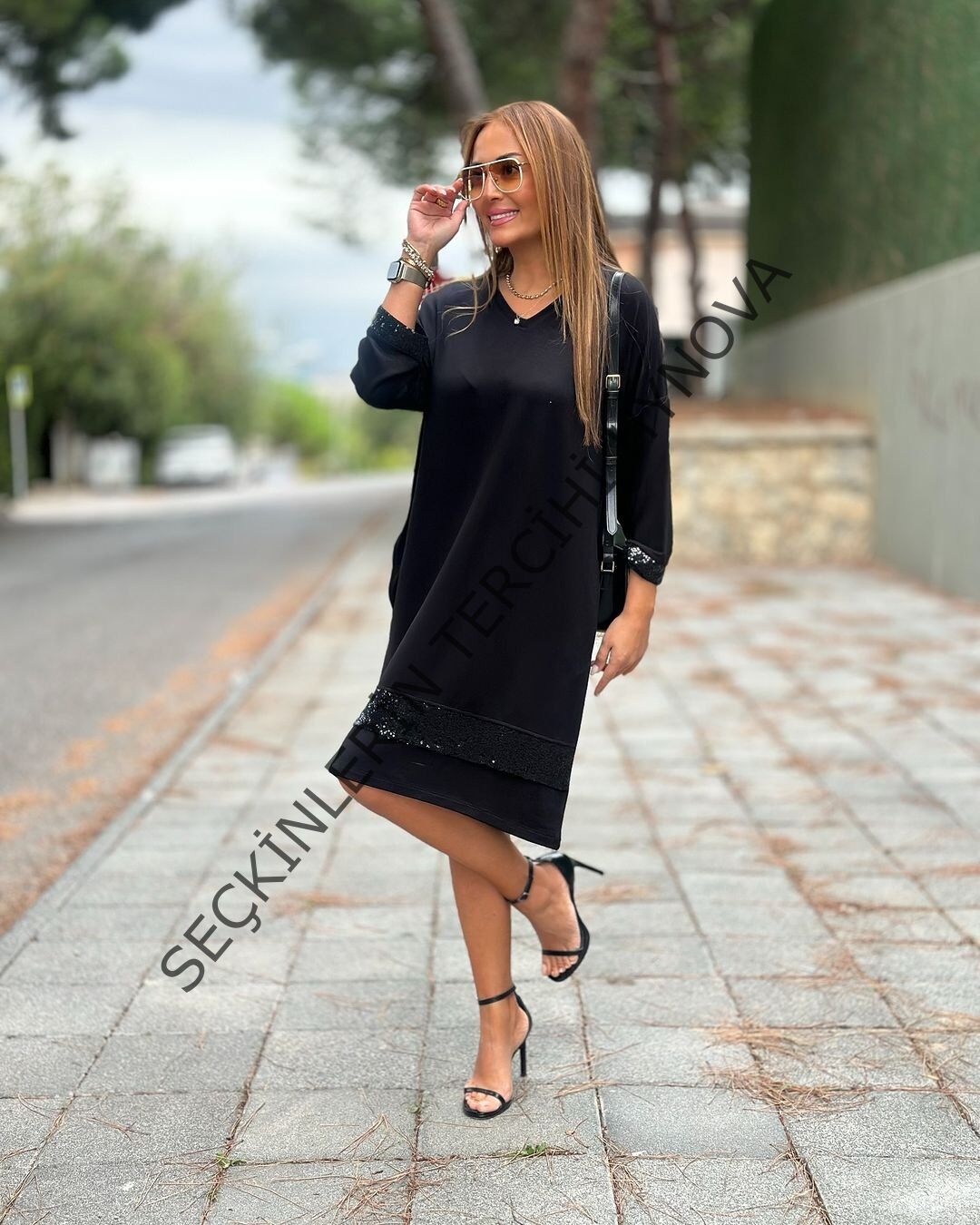 Kadın Modal Kumaş Kol Ve Etek Ucu Payetl Elbise