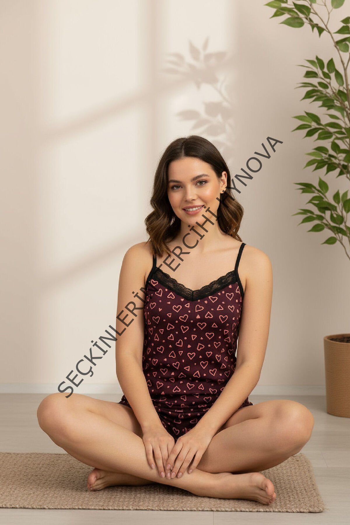 - Kadın Mor Kalp Desenli Askılı Şortlu Dantelli Pijama Takımı, yumuşacık kumaş dokusu ve romantik tasarımıyla ev modasına zarif bir dokunuş getiriyor.