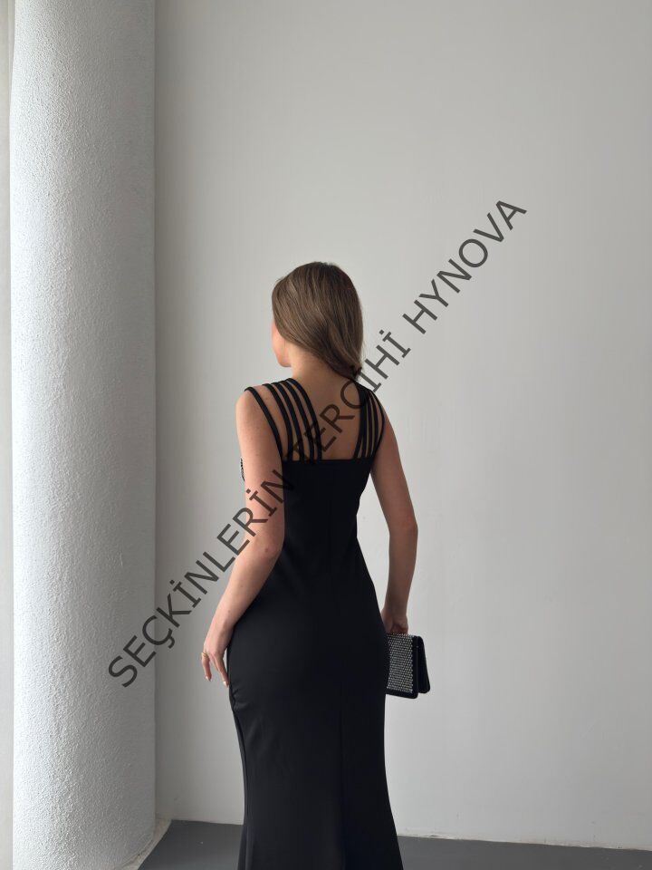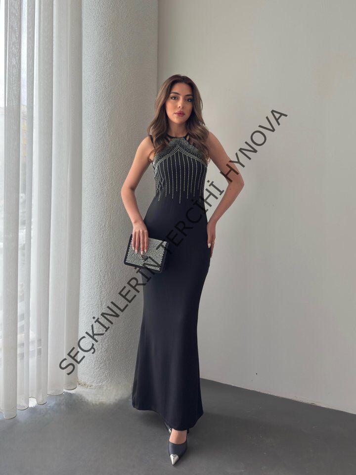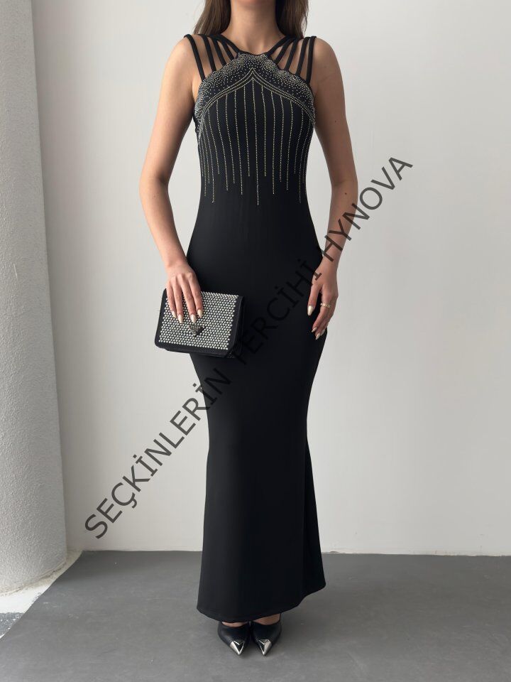 Kadın Omuz çoklu Askılı önü Taş Işlemeli Balık Kesim Janjan Krep Maxi Boy Elbise