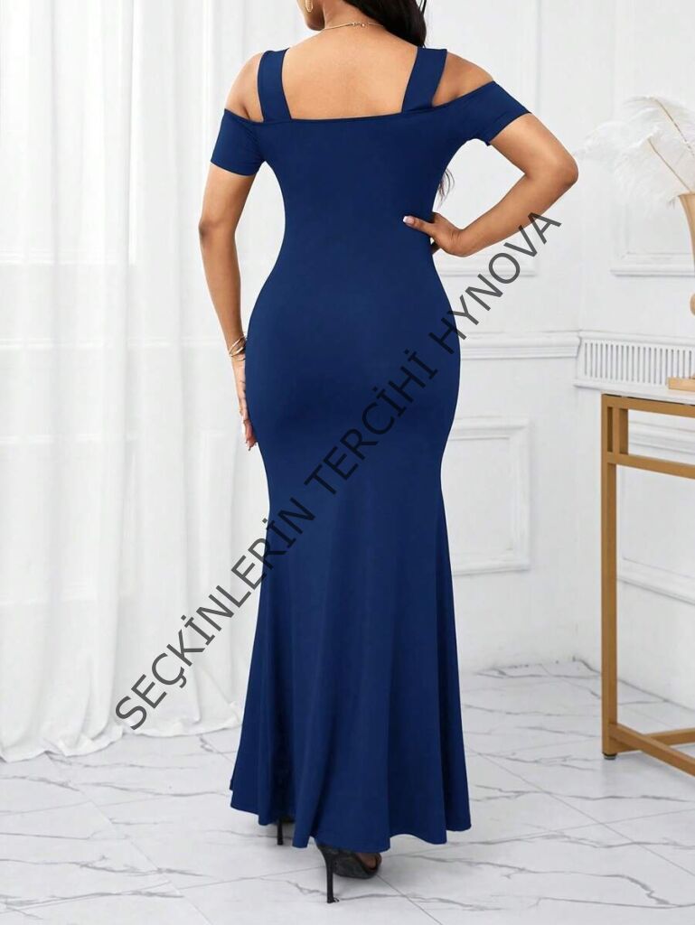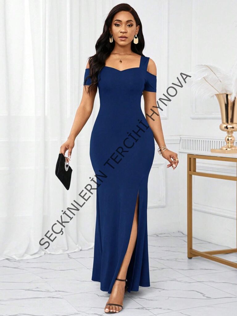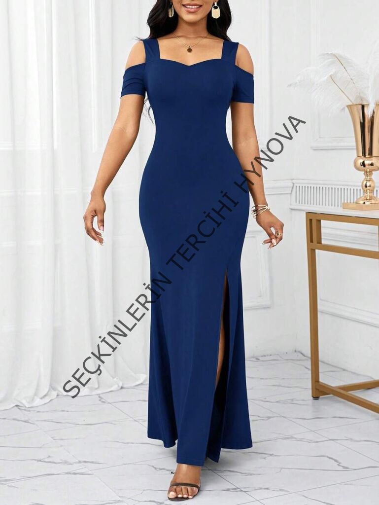 Kadın Omuzlardan Açık Askılı Yırtmaç Detaylı Uzun Ithal Krep Elbise
