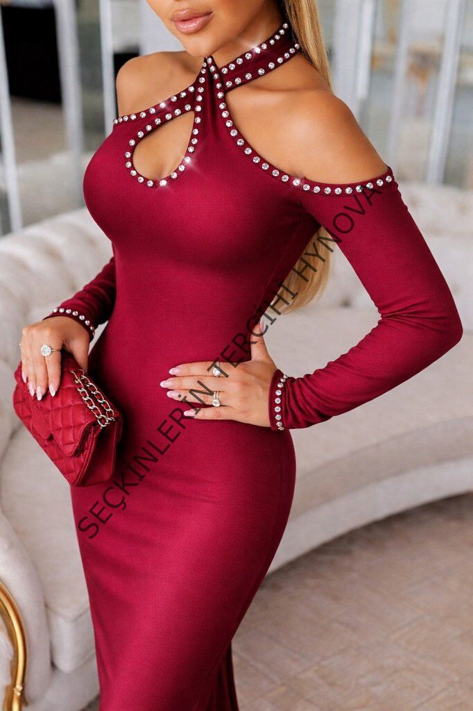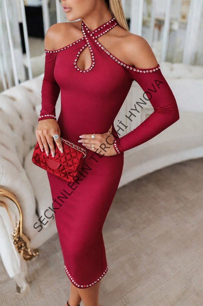 Kadın Omuzlardan Açık Boyundan Geçmeli Damla Detaylı Taşlı Midi Dalgıç Elbise