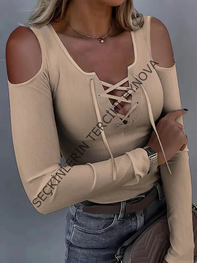 Kadın Omuzlardan Açık Uzun Kollu Bağcıklı Kaşkorse Bluz