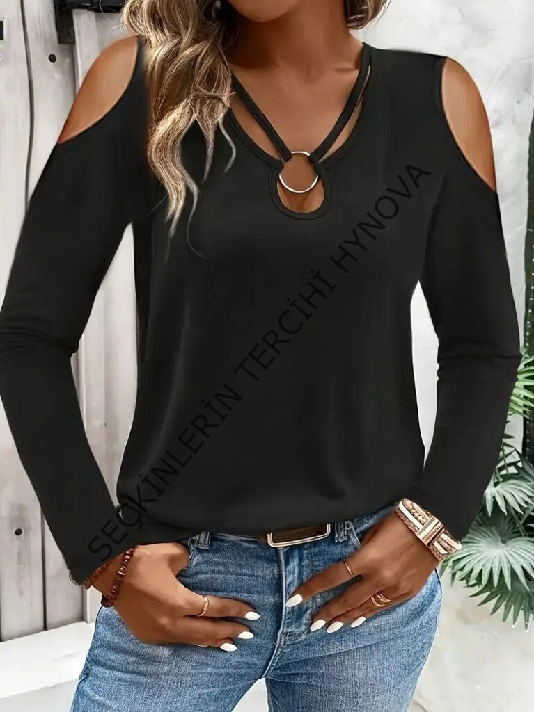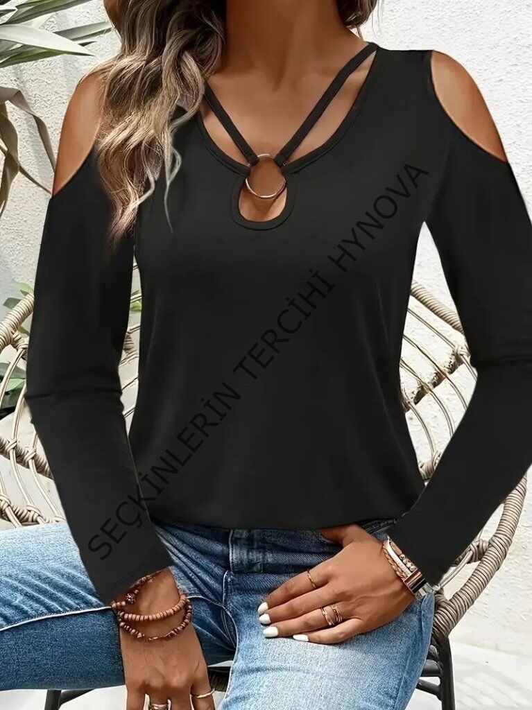 Kadın Omuzlardan Açık Uzun Kollu Yakadan Halka şerit Detaylı Viskon Bluz